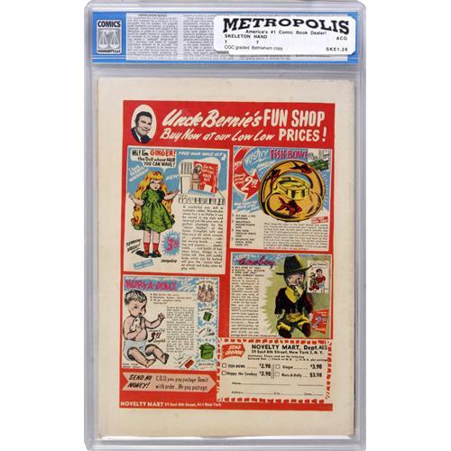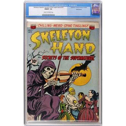 <B>Skeleton Hand #1 Bethlehem pedigree (ACG, 1952) CGC FN/VF 7.0 Cream to off-white pages.</B></I> Ken Bald cover. Charles Sultan and Jon Blummer art. Just one CGC-certified copy has earned a higher grade (VF 8.0) than this copy to date. Overstreet 2006 FN 6.0 value = $132; VF 8.0 value = $268. CGC census 3/07: 2 in 7.0, 1 higher.<BR><BR><b>Shipping:</b> Comics - Slabbed (certified) (<a target=""_blank"" href=""http://www.heritageauctions.com/common/shipping.php"">view shipping information</a>)