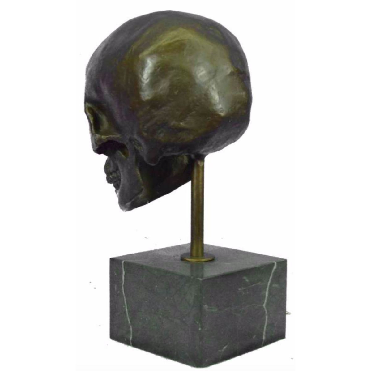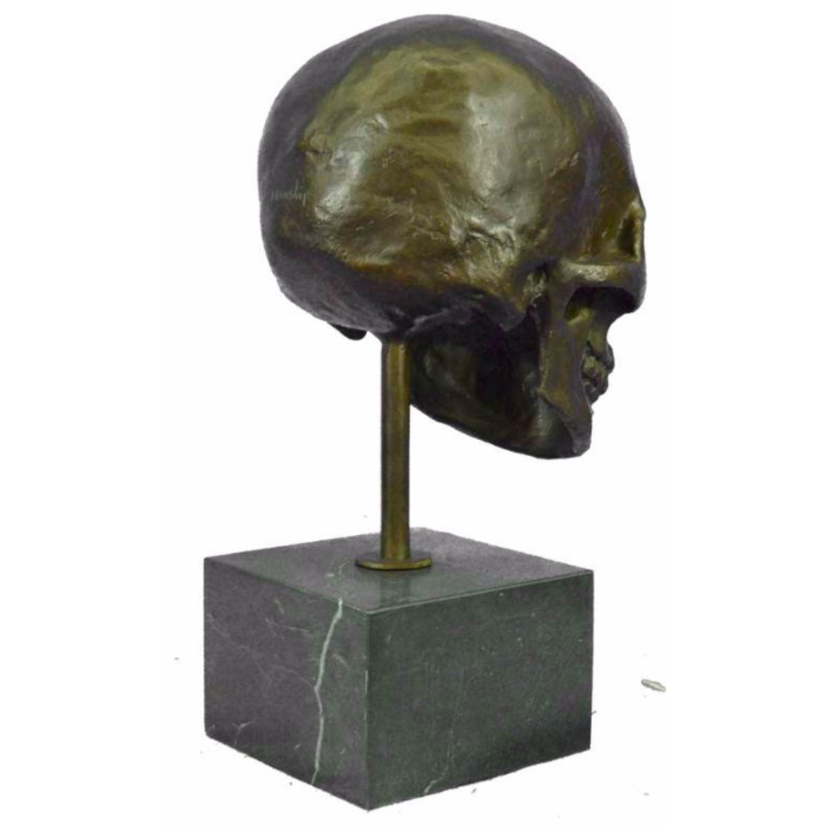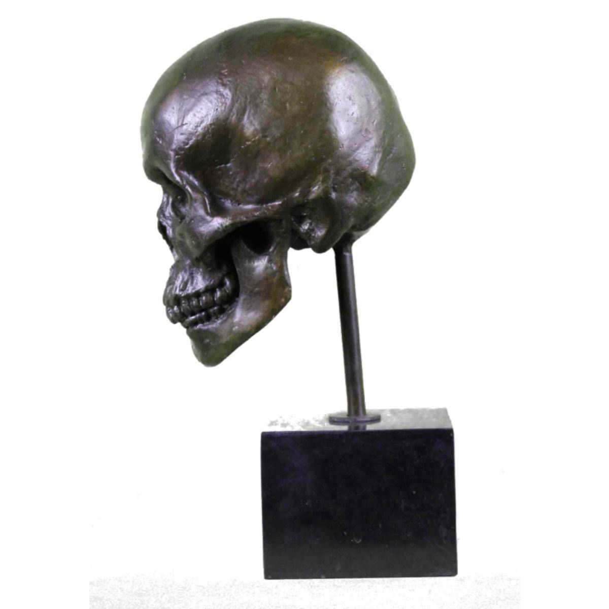 Skeleton skull sculpture. Lost wax casting method bronze, with brown patina, mounted on marble base. 14" H X 7" W. 16lbs.