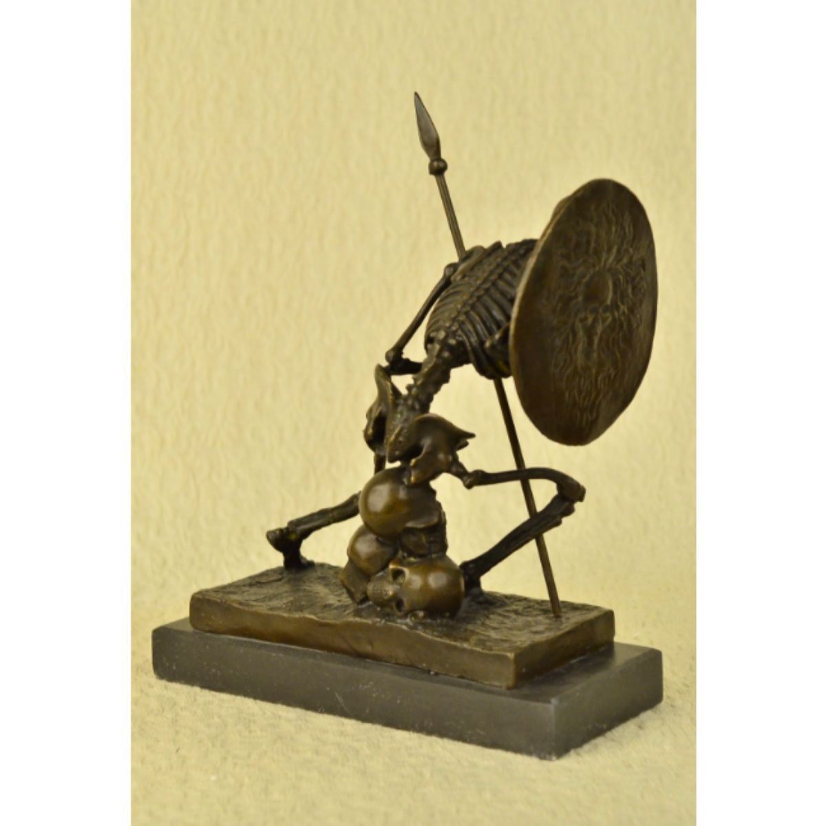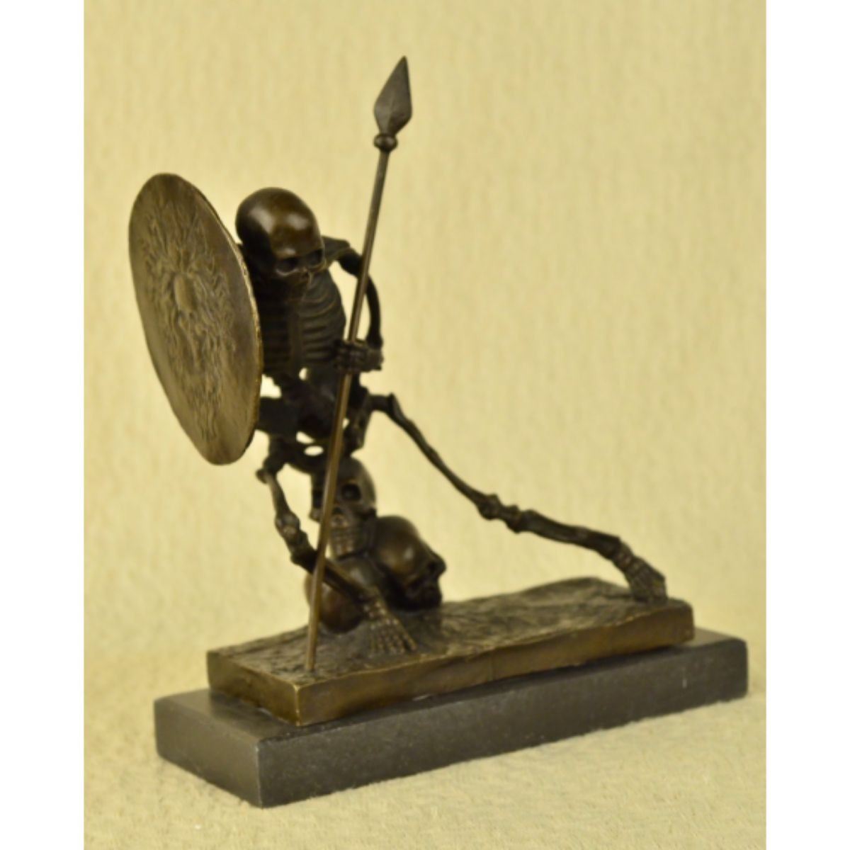 Skeleton warrior with sword & shield, sitting on a stack of skulls sculpture, bookend. Lost wax casting method bronze, with brown patina, mounted on a marble base. 12" H X 10" W. 13lbs.