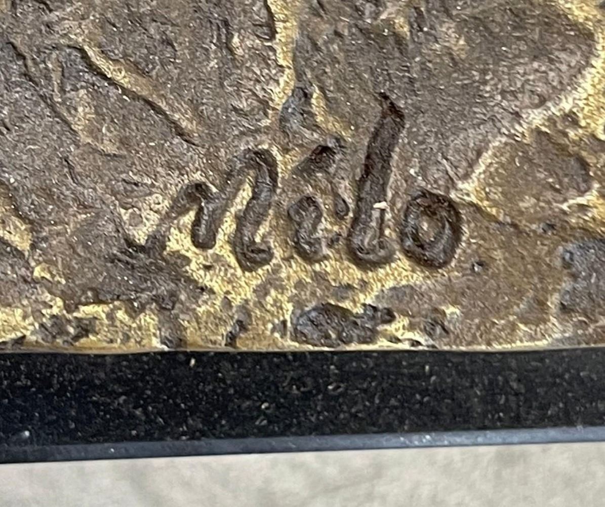 An appealing yet eerie sculpture of a skeleton has been named warrior. The skeleton is seated on a skull and is armed with a shield and spear. A wonderful modern art piece that rests on a black marble base. It is definitely an impressive piece to display capturing death, battle, and fearlessness. This 100% bronze sculpture was created using the lost wax method and is signed by artist Milo.
