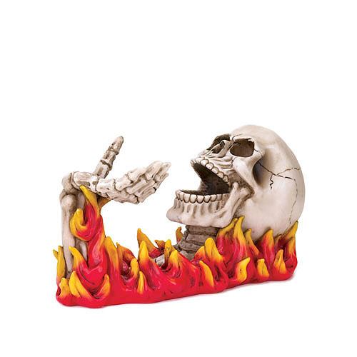 Skeleton Wine Bottle Holder **|**|** Heres a toast to enjoying a great bottle of wine no matter what! This fun wine bottle holder features a skeleton rising up from the flames to take a drink. Set it on your bar or counter and youve got an instant conversation starter with guests. Just add your favorite bottle of wine and this skeleton will be happy to hold it for you. Item weight: 2.0 lbs. 12 x 5-3/4" x 6-1/2" high. Polyresin. Wine bottle not included. UPC: 849179017422."