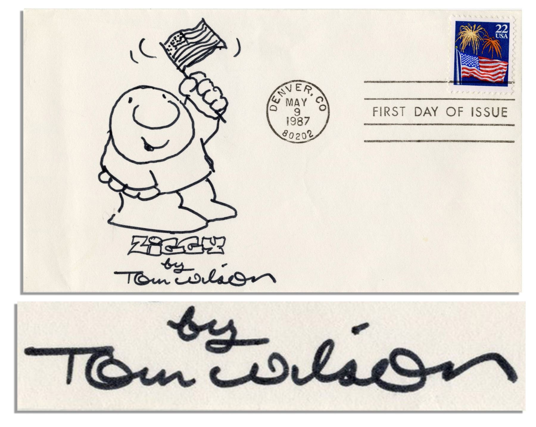 Cartoonist Tom Wilson signs a first day cover, postmarked in Denver on 9 May 1987, commemorating the release of the twenty-two cent American flag and fireworks stamp. Wilson, creator of the ''Ziggy'' comic strip, sketches Ziggy waving an American flag. He signs ''Ziggy by Tom Wilson'' below the sketch. In 1987, Wilson's son, Tom Wilson II, took over the comic strip, which debuted in 1971. The 6.5'' x 3.5'' cover is in fine condition.