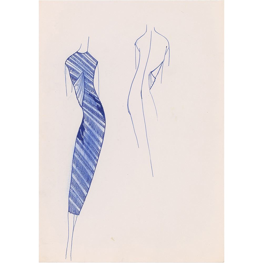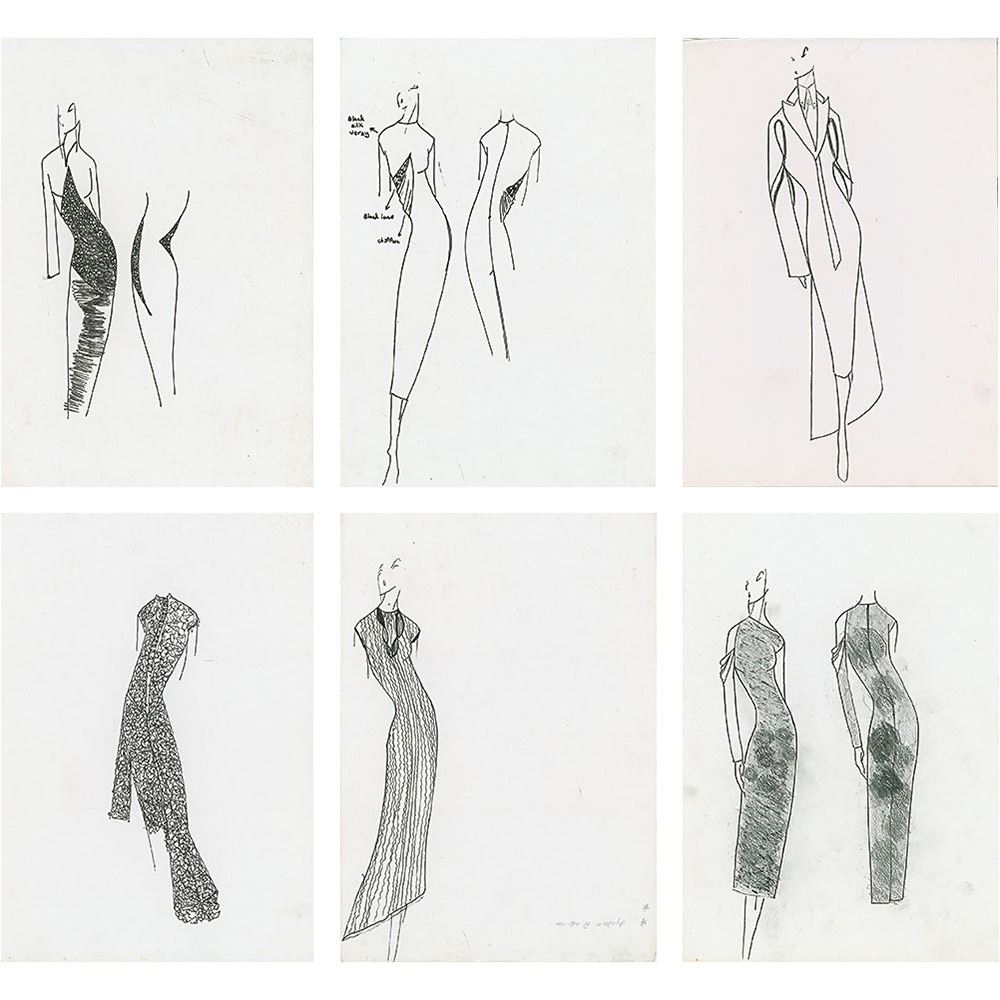 Extraordinary sketchbook belonging to fashion designer Alexander McQueen, which contains an assortment of 36 original drawings made by McQueen during a business trip to visit Italian manufacturers during the mid-1990s. The design sketches found within this Daler Rowney Layout Pad, 11.75? x 8.25?, are of varying degrees of completion and are accomplished in graphite and various ink types, with one design bearing stamp marks and another featuring annotations in relation to desired fabric like silk, lace, and chiffon. Included are a few photocopies of model figures that McQueen has used as design templates, three of which are dated to "S. S. 1996," which corresponds to McQueen's Spring/Summer 1996 collection, 'The Hunger,' which was held at London's Natural History Museum on October 23, 1995. Many of the sheets are laid loosely within the sketchbook. In fine condition, with some creasing and paper loss to edges from having been removed from sketchbook; the designs themselves are all entirely unaffected. Accompanied by five photocopies of McQueen design sketches, each dated to 'The Hunger' collection.