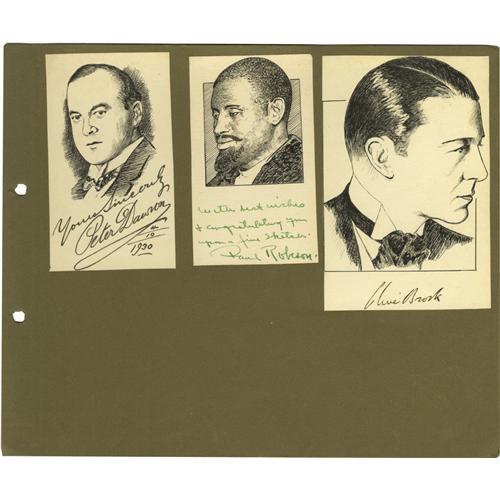 <B>Original Celebrity Sketches Signed By Paul Robeson and Others.</B></I> A selection of three small pen-and-ink sketches by Robeert L. Whittington of various celebrities from the Golden Age of Hollywood, signed by their respective subjects and affixed to a 11.5" x 9.5" photo album page. Included are Paul Robeson, Clive Brook, and Peter Dawson. In overall Excellent condition with occasional instances of tanning and/or soiling.<BR><BR><b>Shipping:</b> Flat Material, Small (<a target="_blank" href="http://www.heritageauctions.com/common/shipping.php">view shipping information</a>)