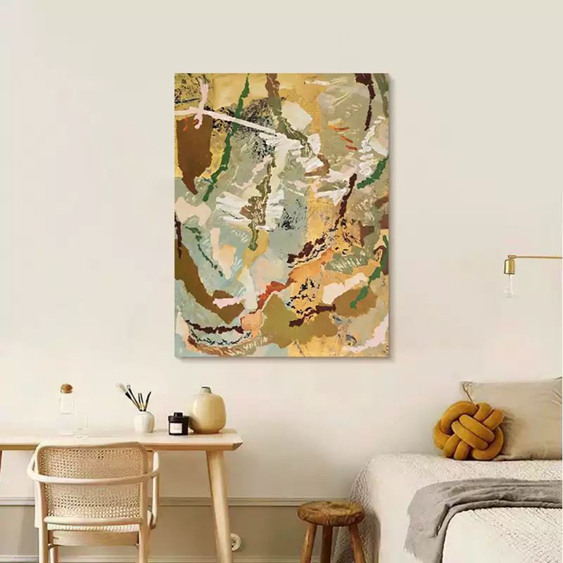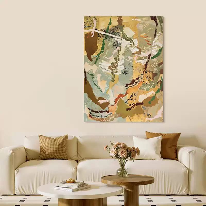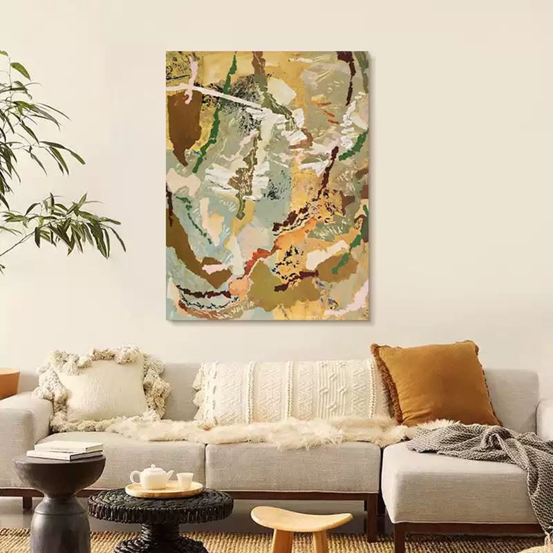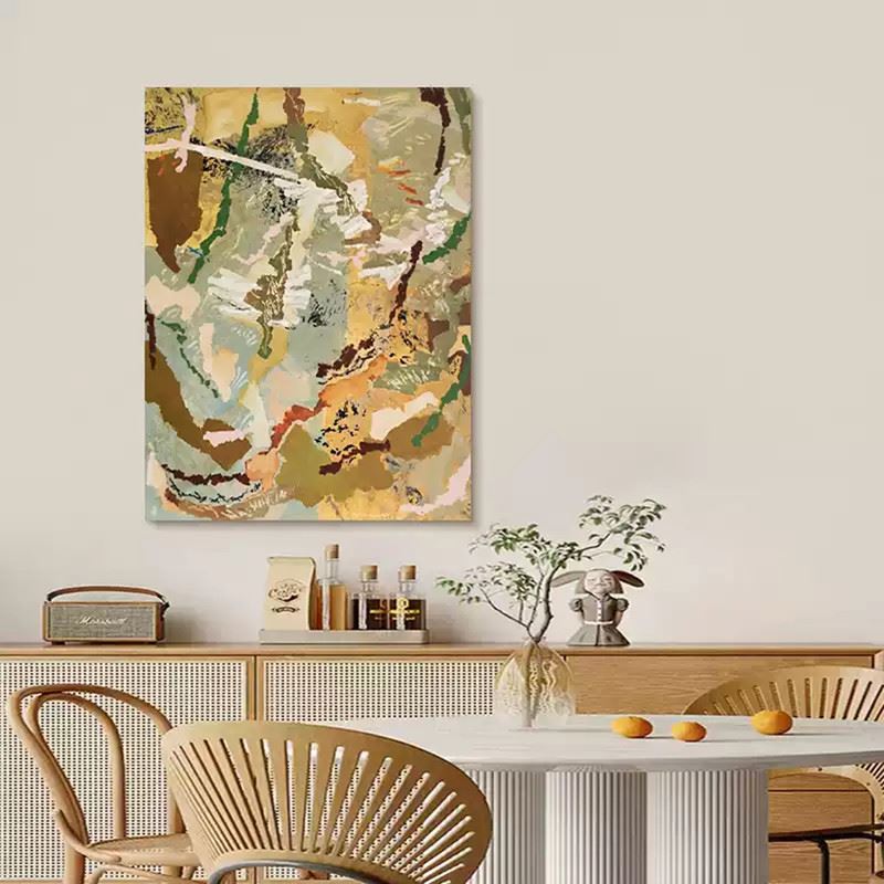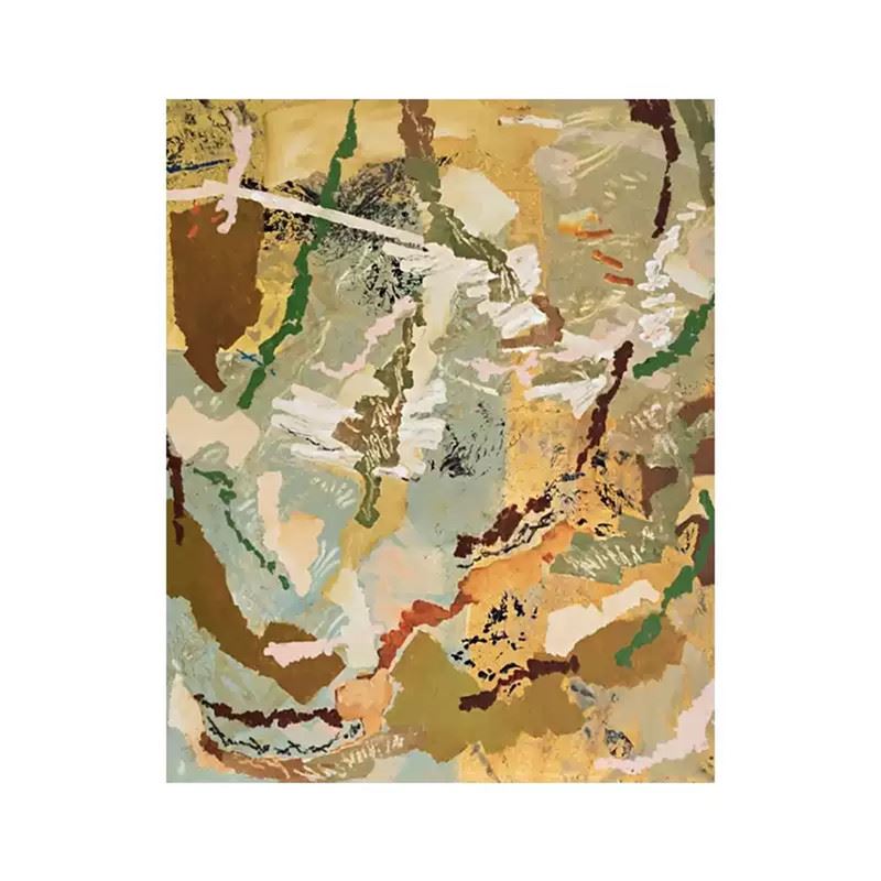 This artwork uses natural color blocks and abstract brushstrokes to depict the flow of thoughts. The interplay of greens, browns, and golds feels like complex thoughts from deep within, gathered into a composition through the simple strokes of the brush, conveying a sincere and unique emotion. Dimensions: 24 x 31 inches.