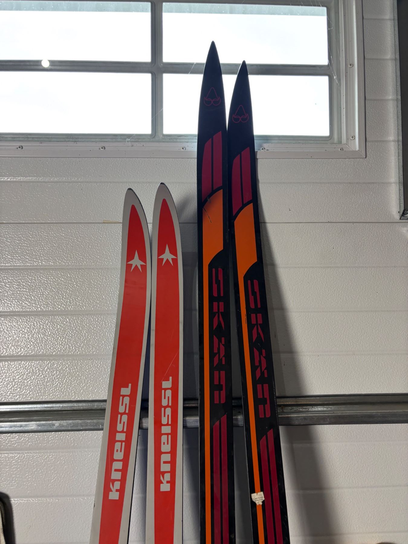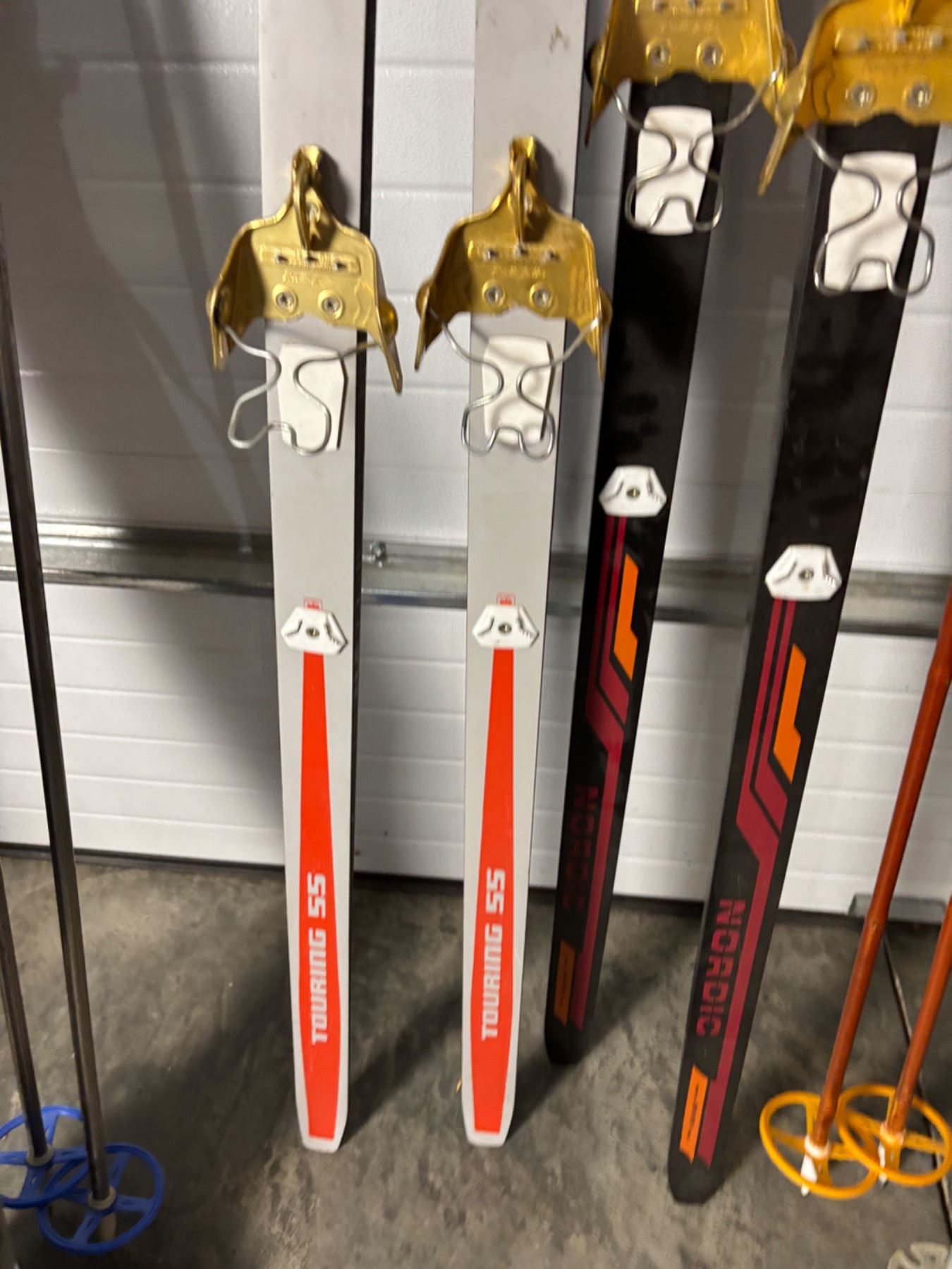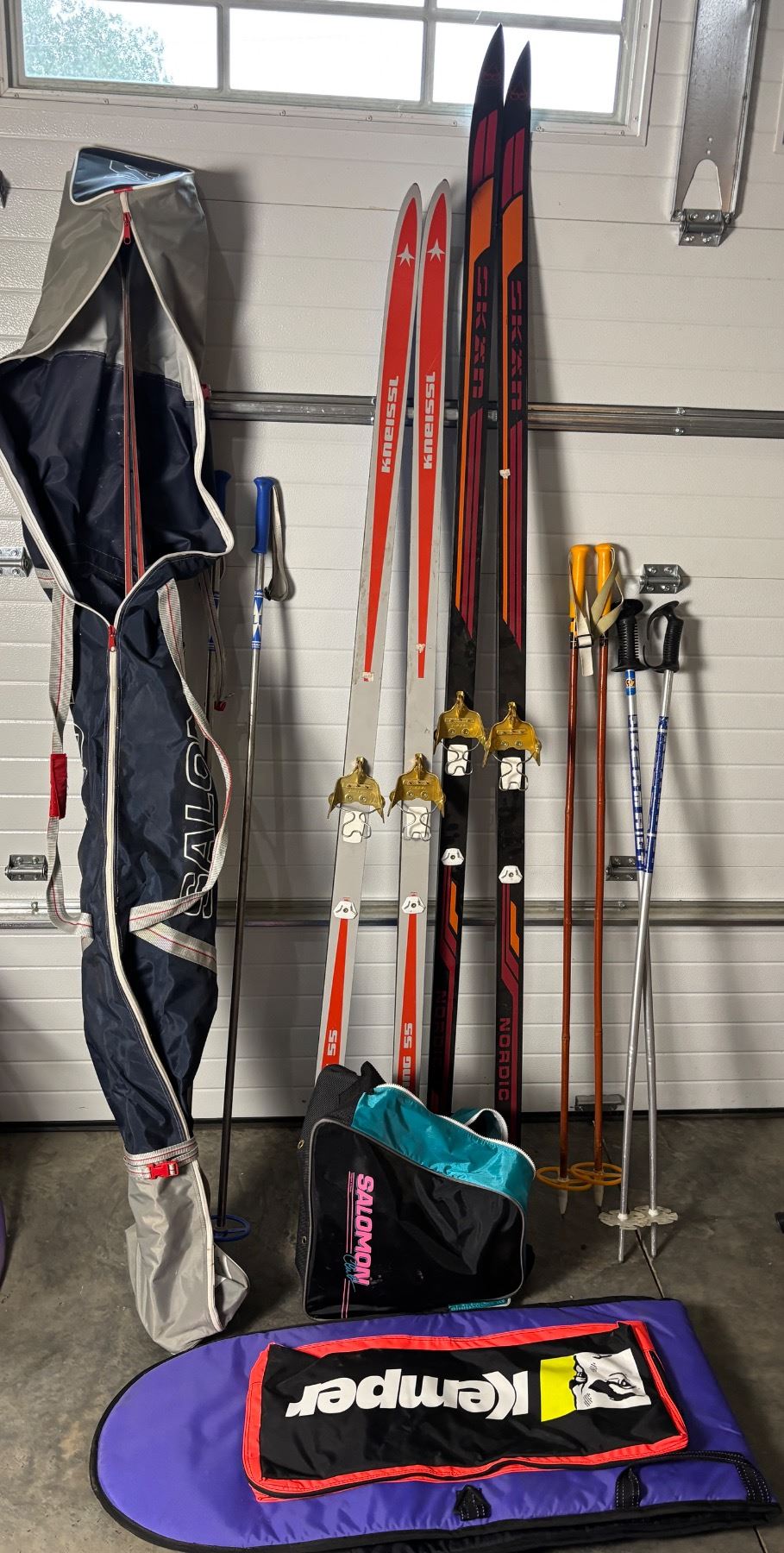 Includes two pairs of cross country ski's and poles (83 & 74"L), Head Racing Ski's (76"L) and Nordica Boots, and more
