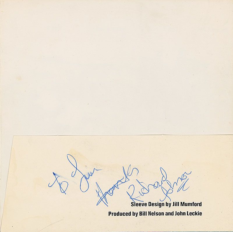 Four-song 45 rpm record including ‘Masquerade,’ and ‘Out of Town,’ signed on the inside of the folder by Richard Jobson (ins), Stuart Adamson, William Simpson, and Thomas Kellichan. Some scattered light creases as well as a bit of light soiling over a couple of signatures, otherwise fine condition. Accompanied by a full letter of authenticity from Roger Epperson/REAL.