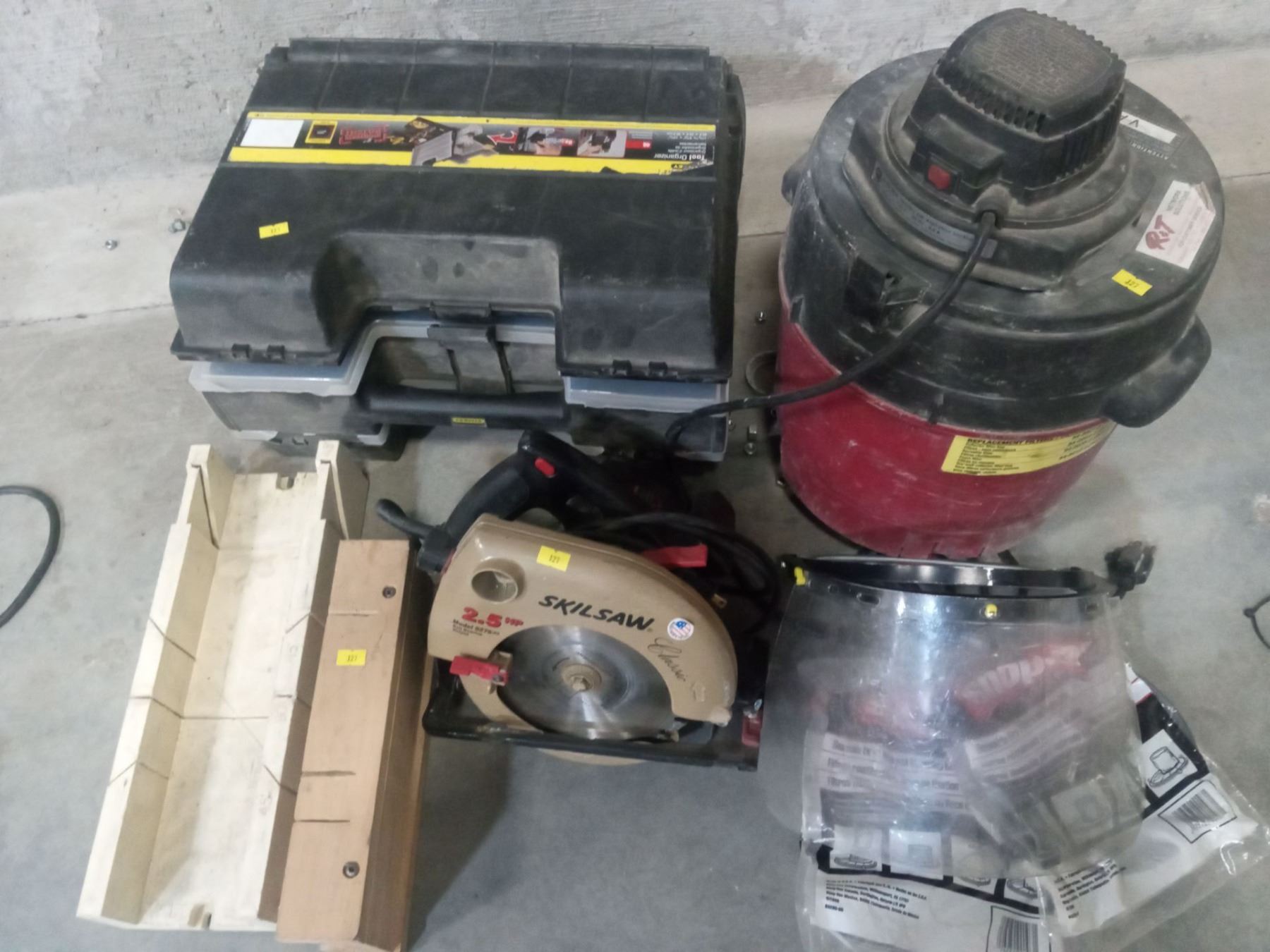 SkilSaw, Shopvac, Miter Boxes, Face Shield and Screw/Bolt Storage Box