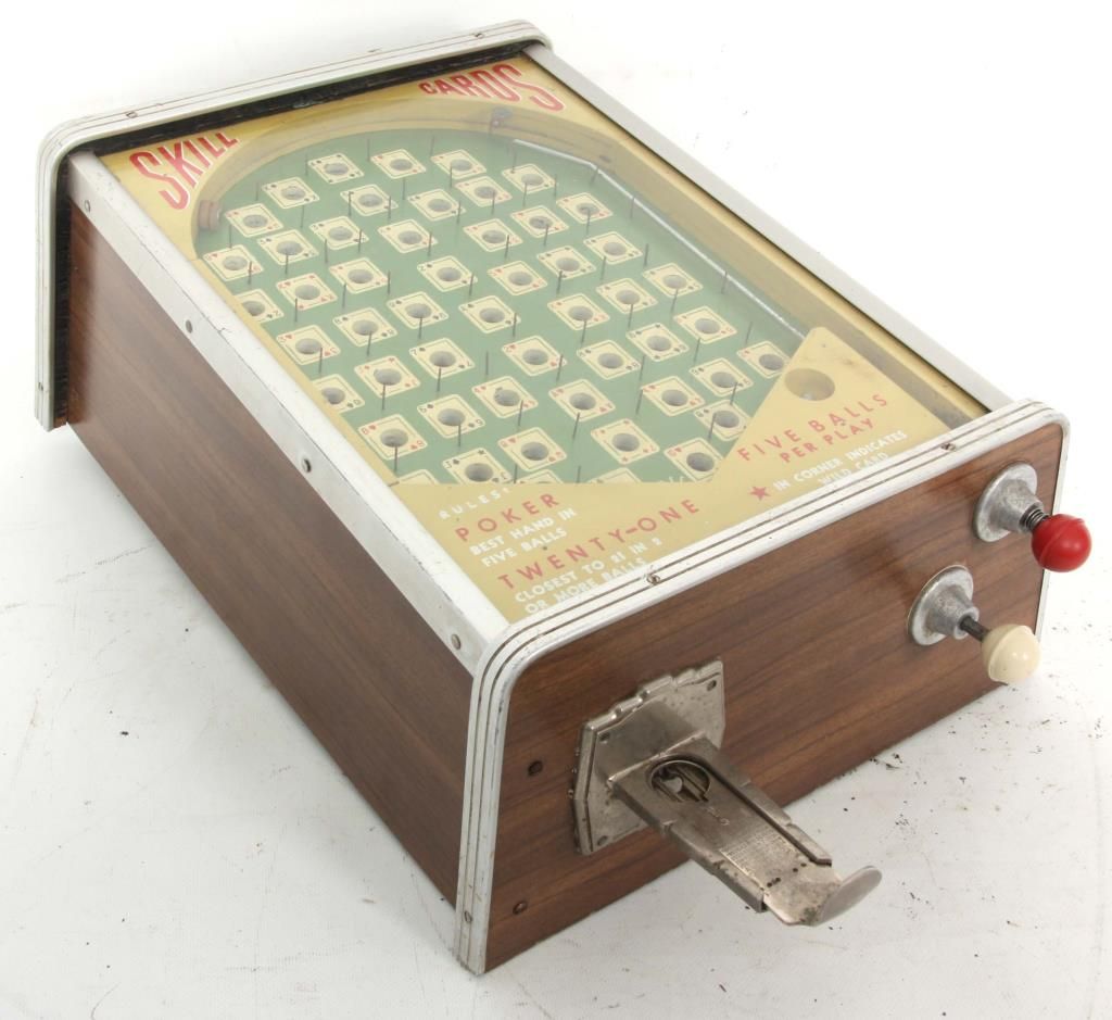 Skill Cards Pinball Style Trade Stimulator. Pinball style poker game has a wood case with metal straps; yellow back panel with red lettering and a green game board with 52 white playing card slots. 5 cent coin slot and 2 playing knobs in the front of the case. Circa 1936, by the A.B.T. Manufacturing Co. 8 in. high x 13 in. wide x 20 in. deep.