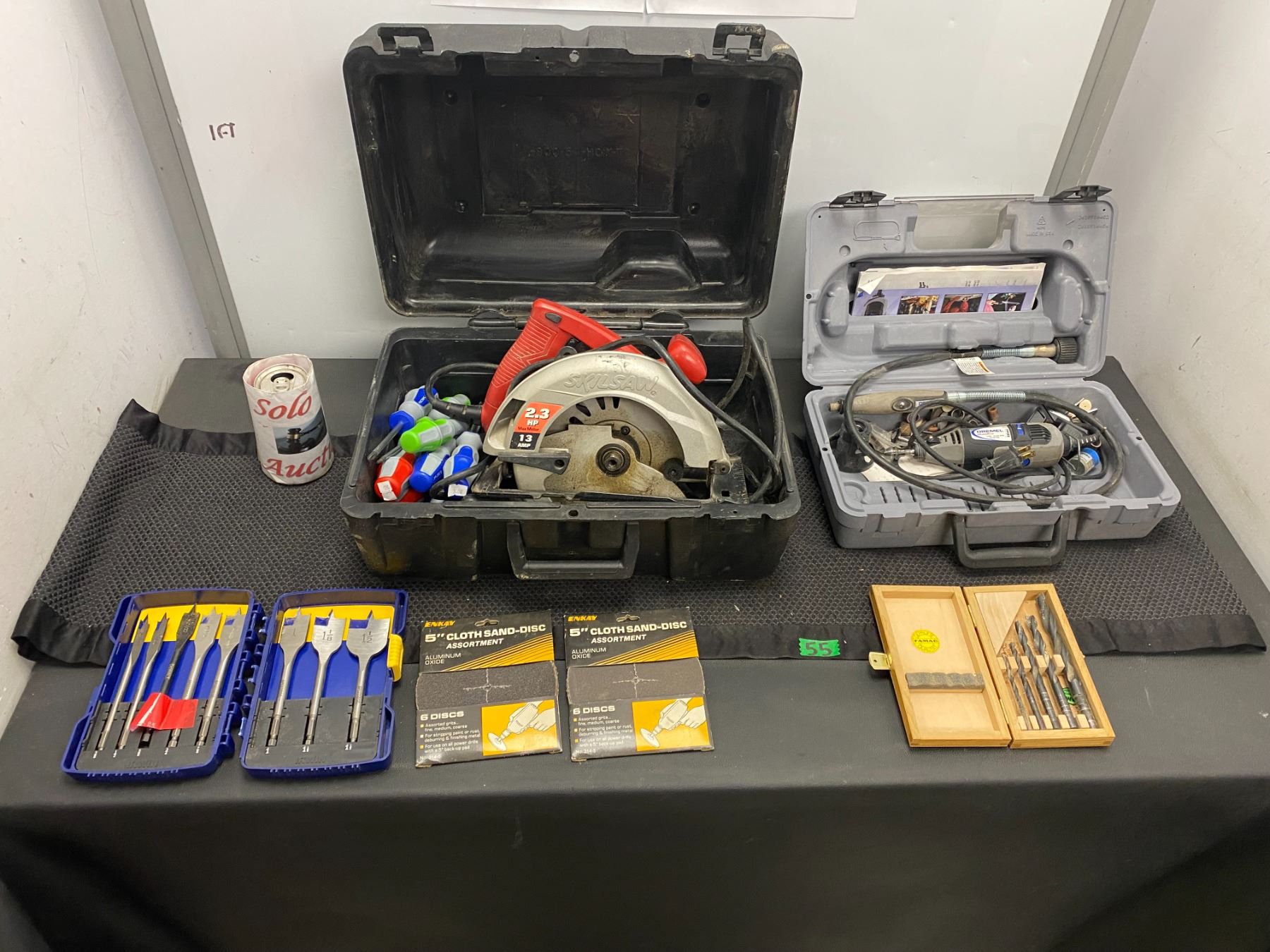 Skilsaw brand circular saw corded, Dremel rotary tool, drill bits, spade bit set and more