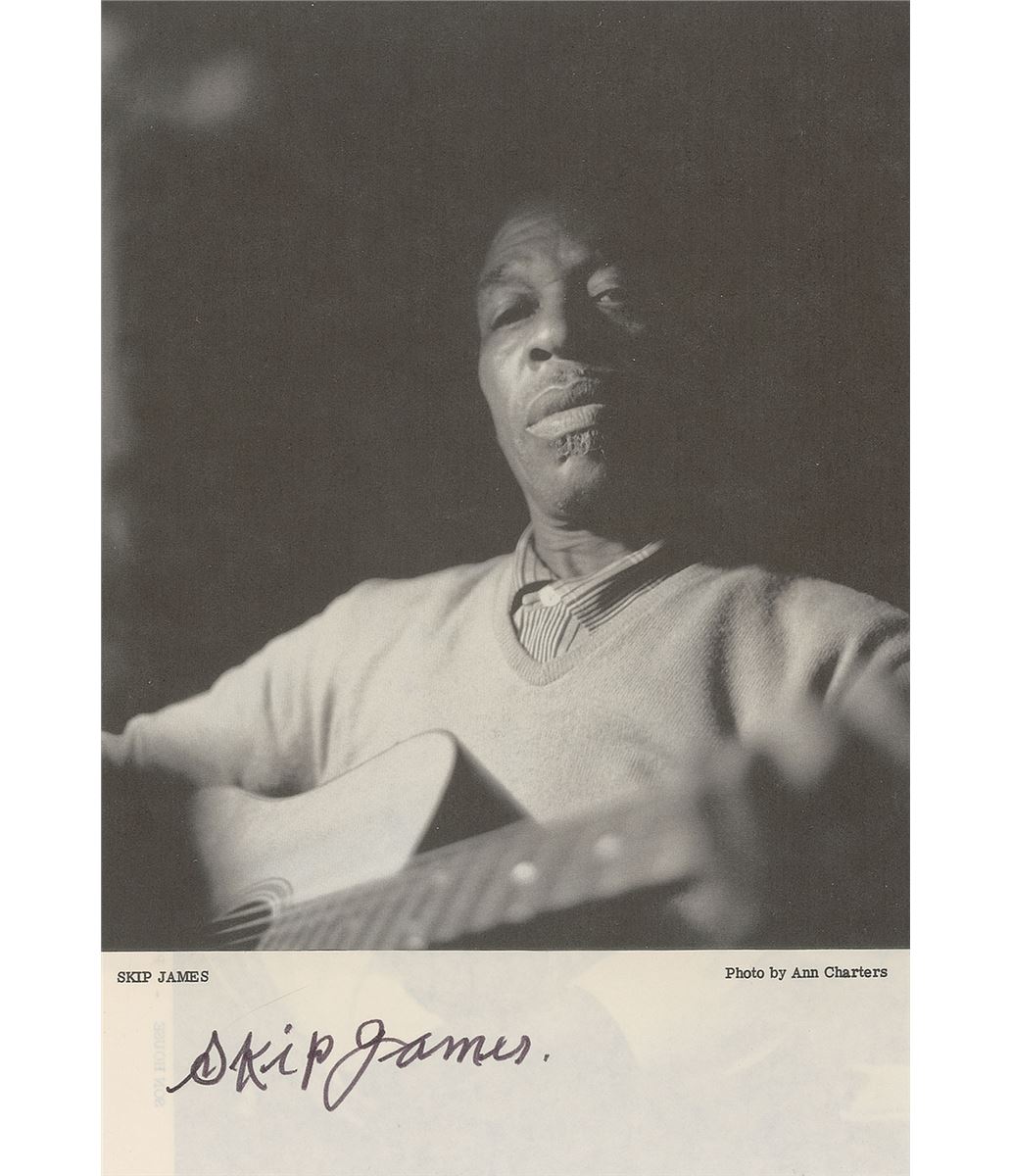 Delta blues singer, guitarist, pianist, and songwriter (1902–1969). Scarce 6.5 x 9.25 book photo of James holding an acoustic guitar, signed on a caption slip affixed to the bottom edge in black tip. In fine condition.
