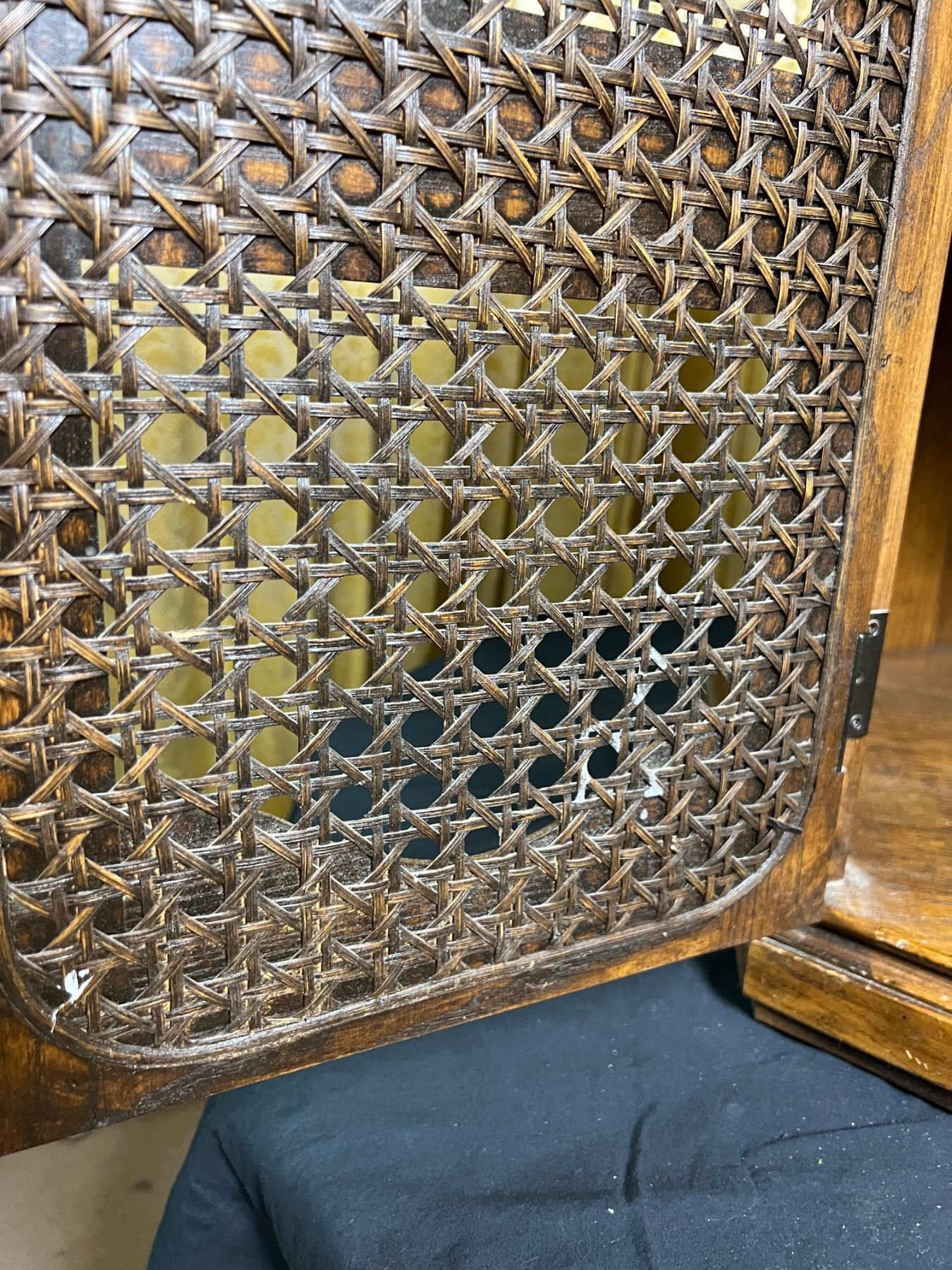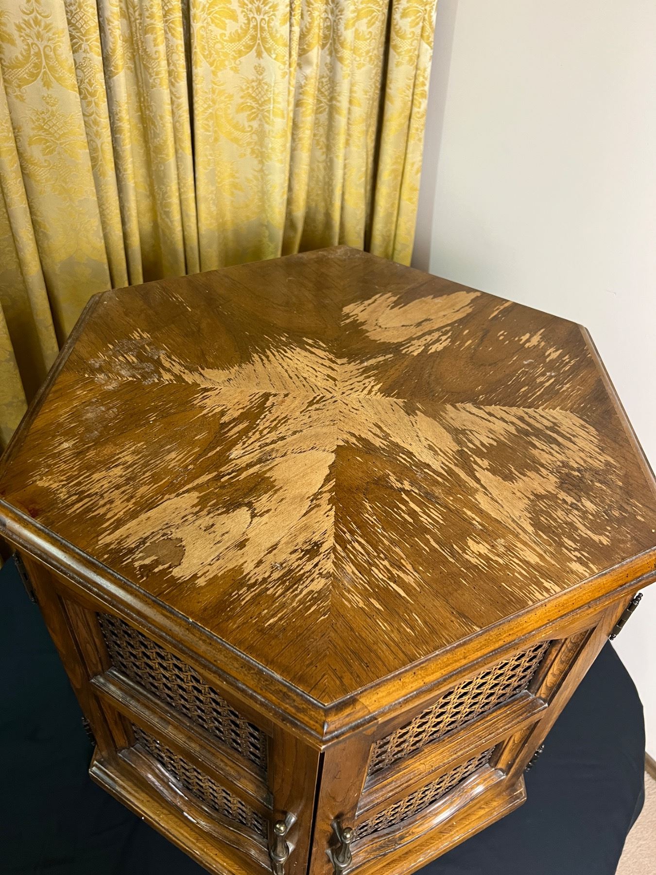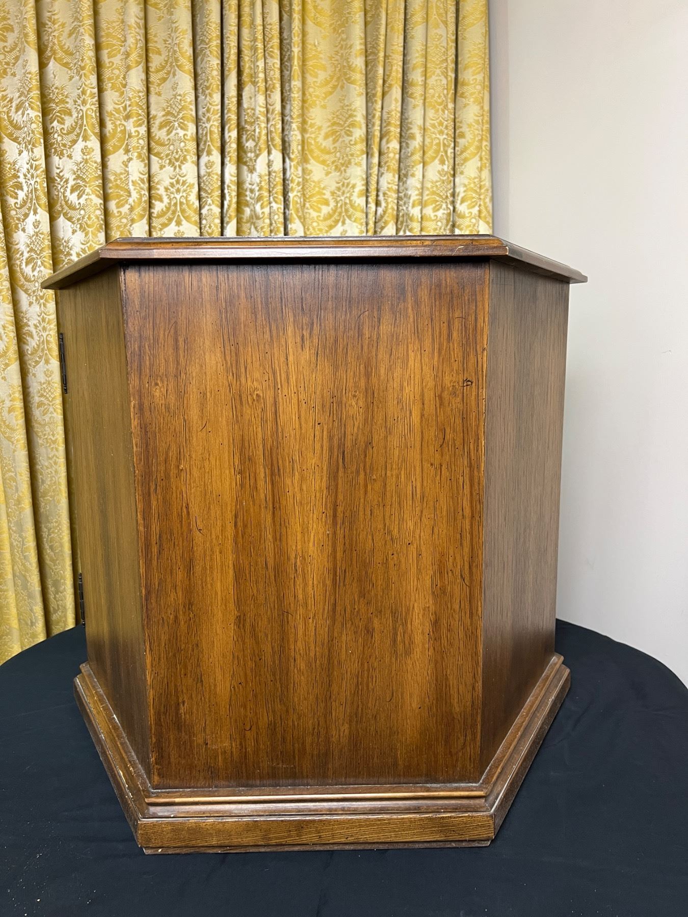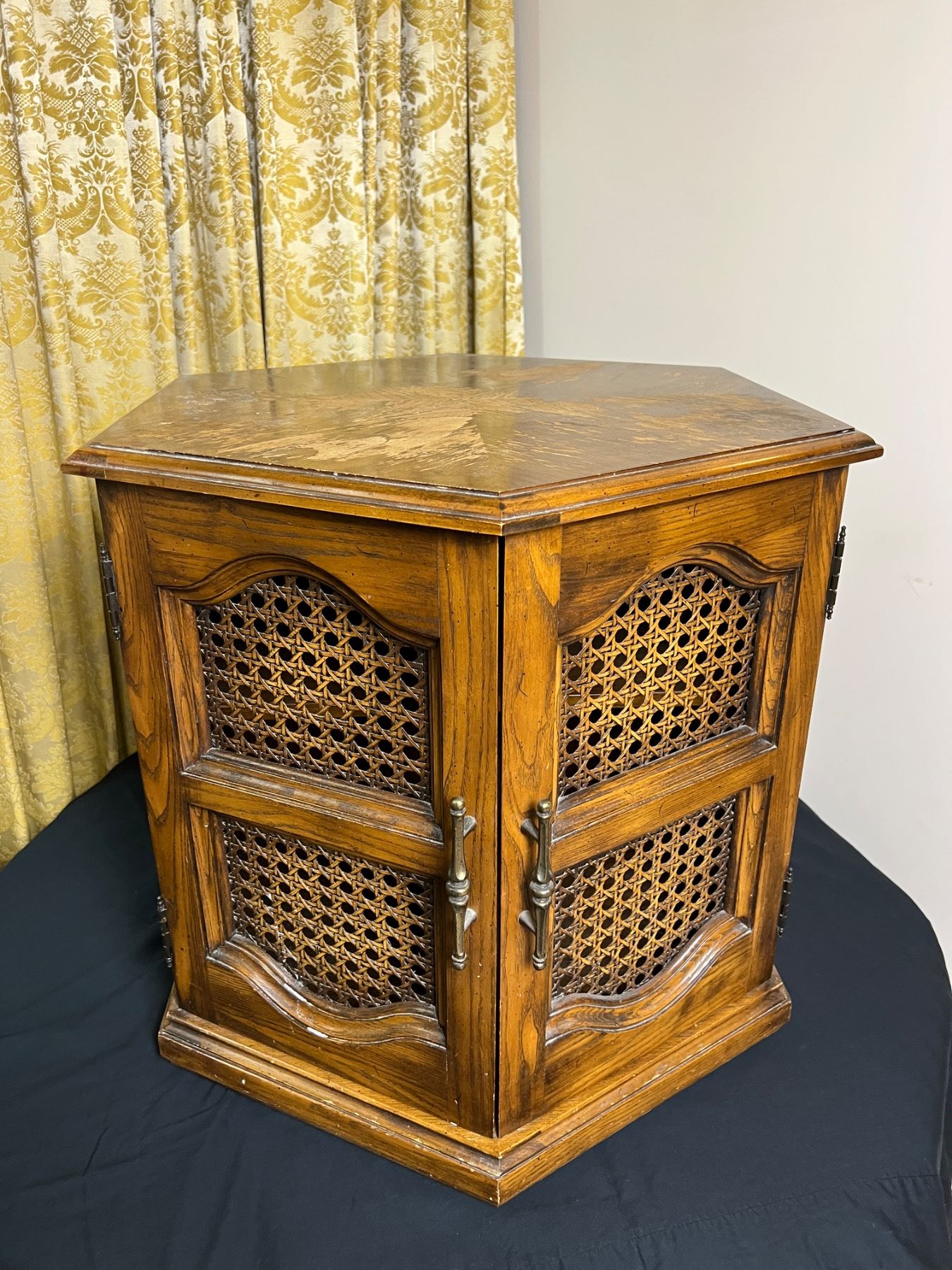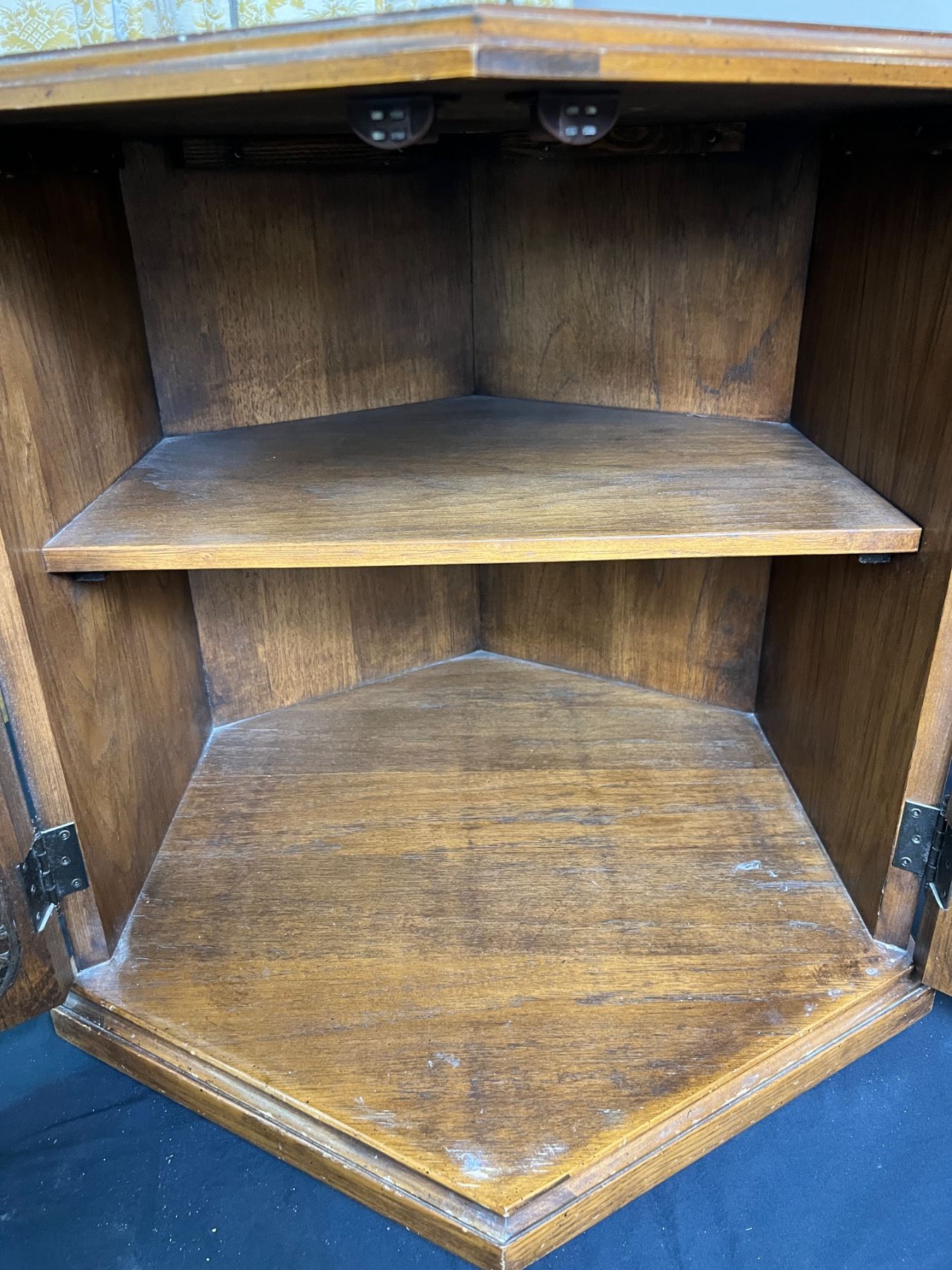 Vintage piece measures 24" tall by 24" by 27". Has marks to top surface and on inside of doors. Dust stains in corners of interior