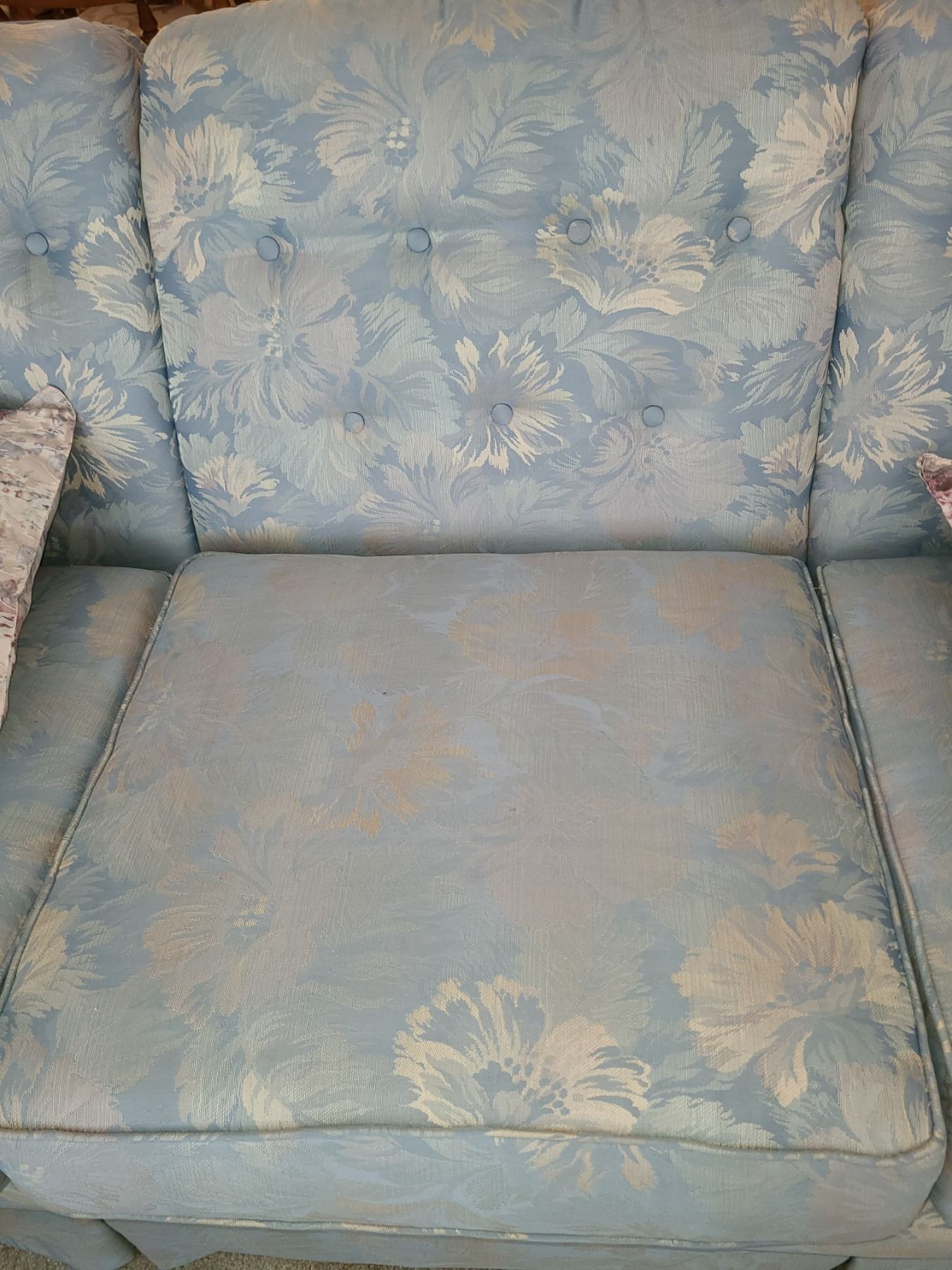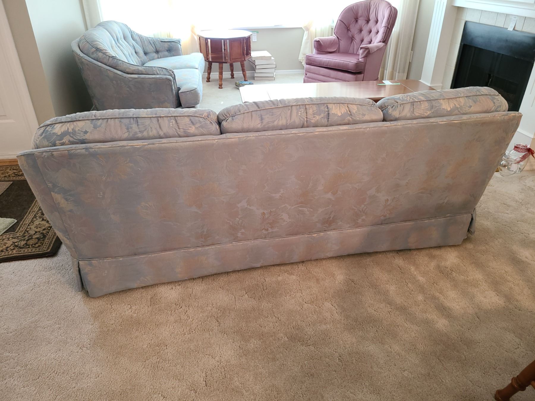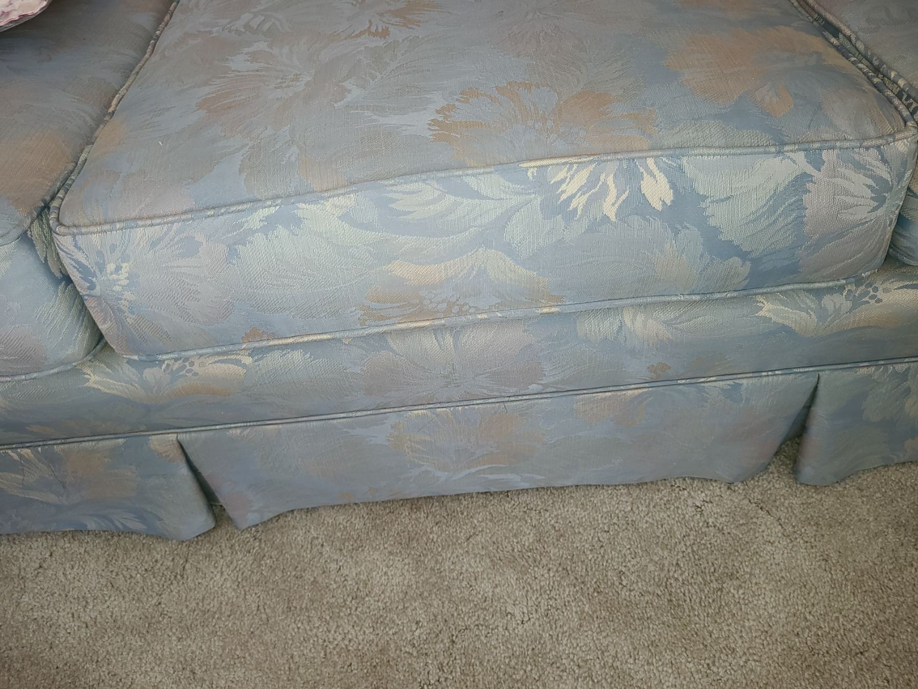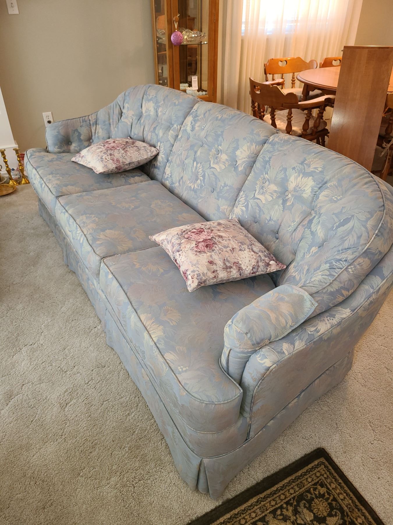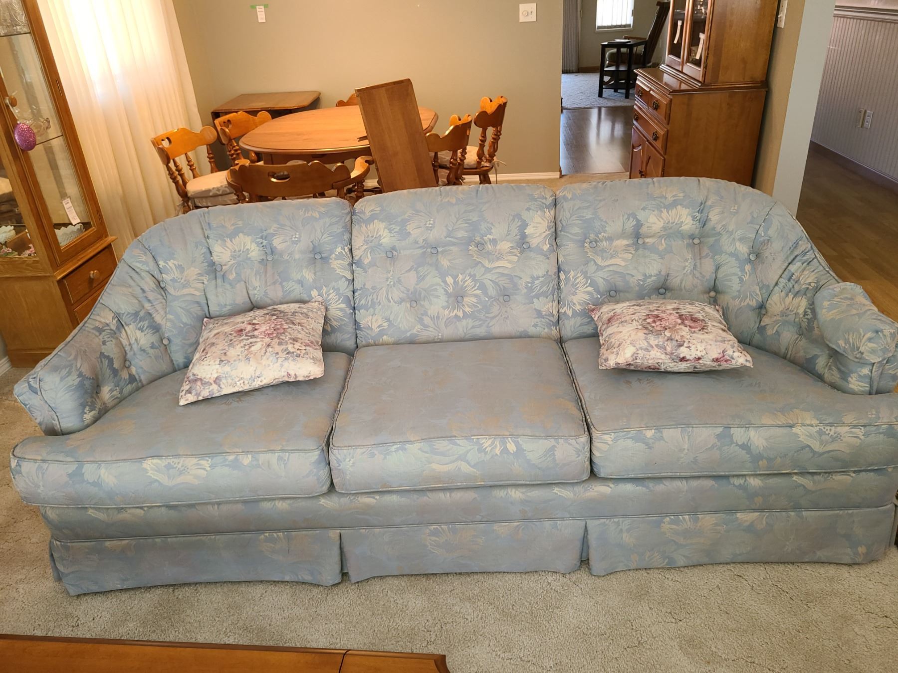 Couch in blue and ivory, )89x22x34. Heavy bring help to move and pick up at 11am