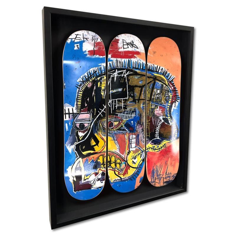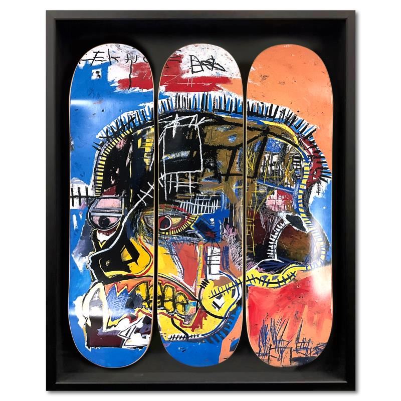 Skull is a skateboard triptych by Jean-Michel Basquiat (1960-1988), bearing the plate signature of the artist inverso. This triptych comes custom framed. Includes Letter of Authenticity. Measures approx. 37 x 30 (frame), 32 x 24 (skateboards).