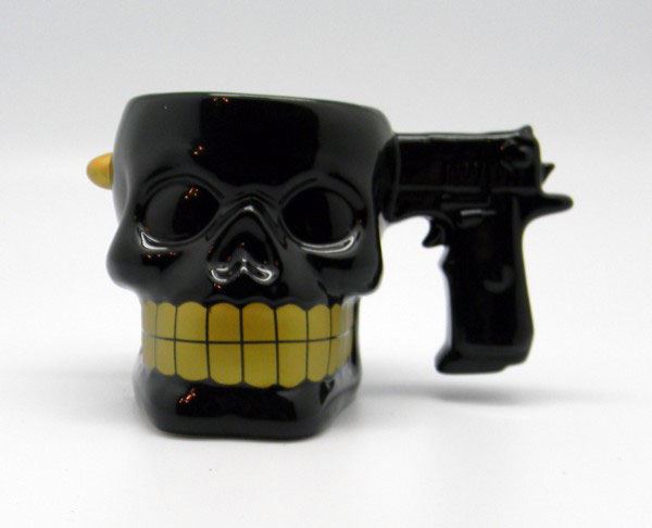 Skull with Gun as Handle Mug. Looks like a bullit is **|**|** Skull with Gun as Handle Mug. Looks like a bullit is coming out the other side of the skulls head! 3 1/2 inches tall.