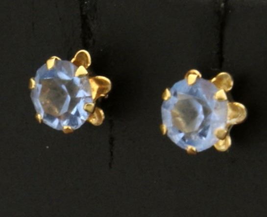In 14k yellow gold, containing 4.5mm sky blue crystal gemstone per earring. With friction backs. 0.7g.