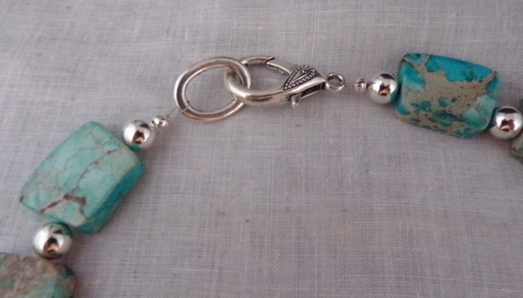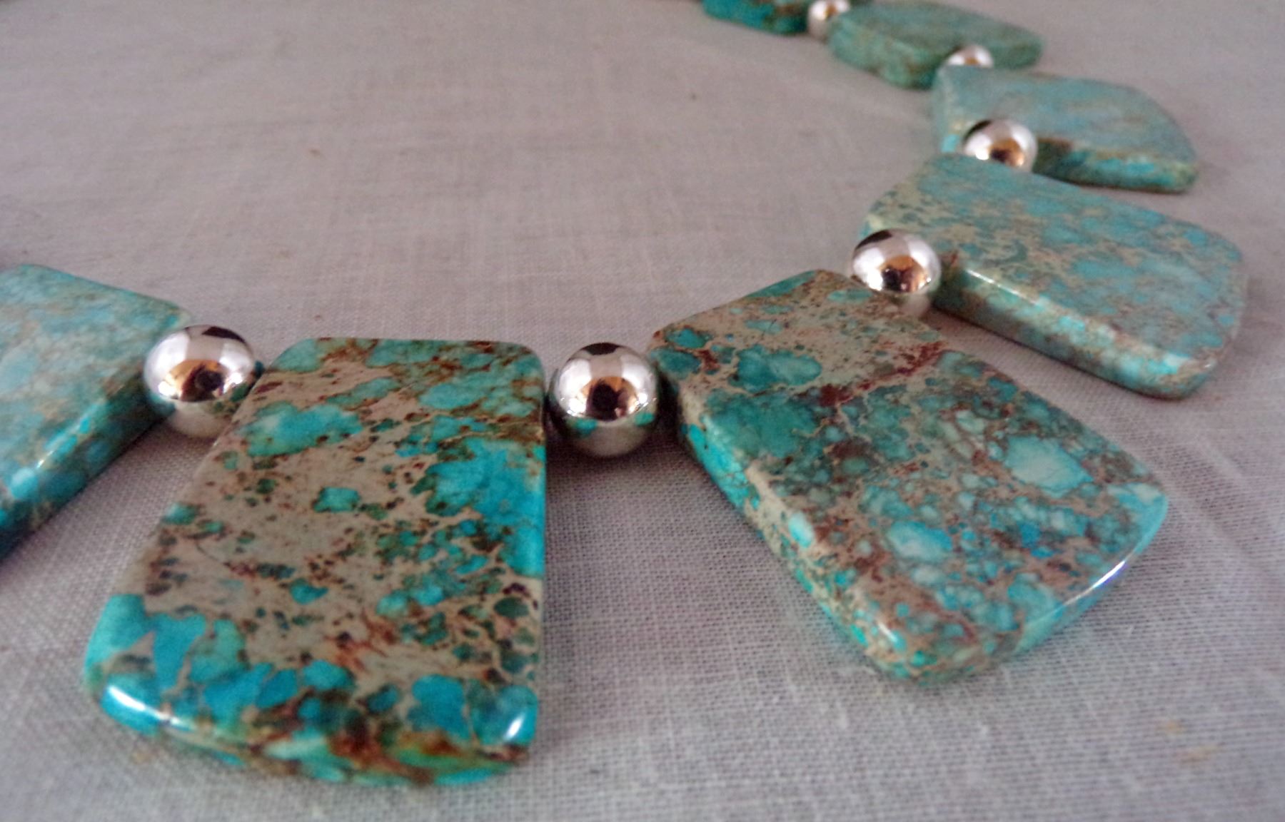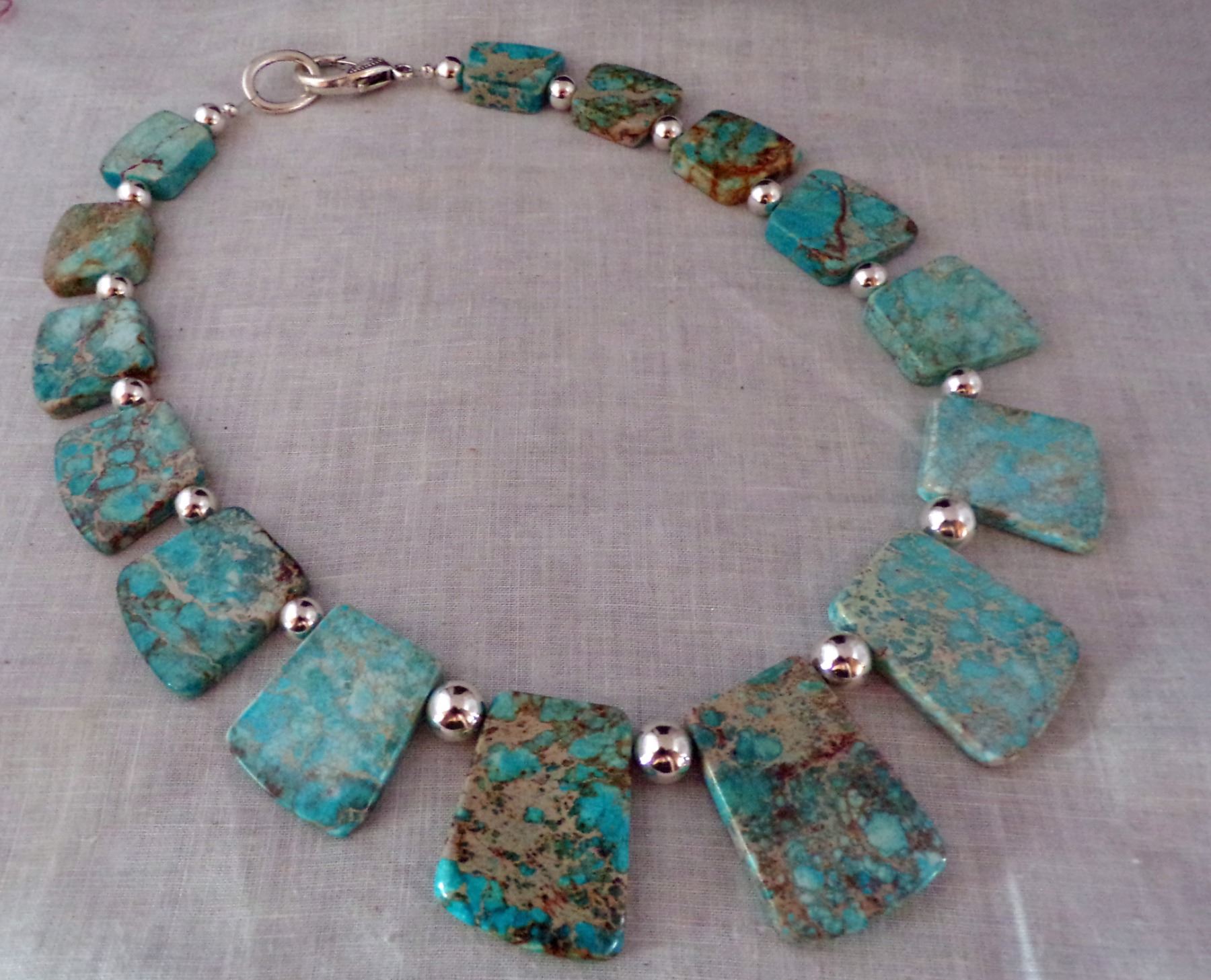Quail Ridge Studios Sky Blue Impression Jasper Turquoise Trapezoid Collar Necklace by Larry McLellan, graduated trapezoid slabs of turquoise impression jasper with 8mm silver-tone beads as spacers, measures 20'' with large lobster claw closure, The magic of the Desert Southwest is timeless in its display of open landscapes, sunrise and sunset colors with infinite possibilities of artistic expression. The design studio of Quail Ridge was founded on these possibilities, forging an endless variety of earthen gems to their metallic counterparts. The artist, Larry McLellan, designs jewelry contemporary in style, while maintaining elements of native designs.