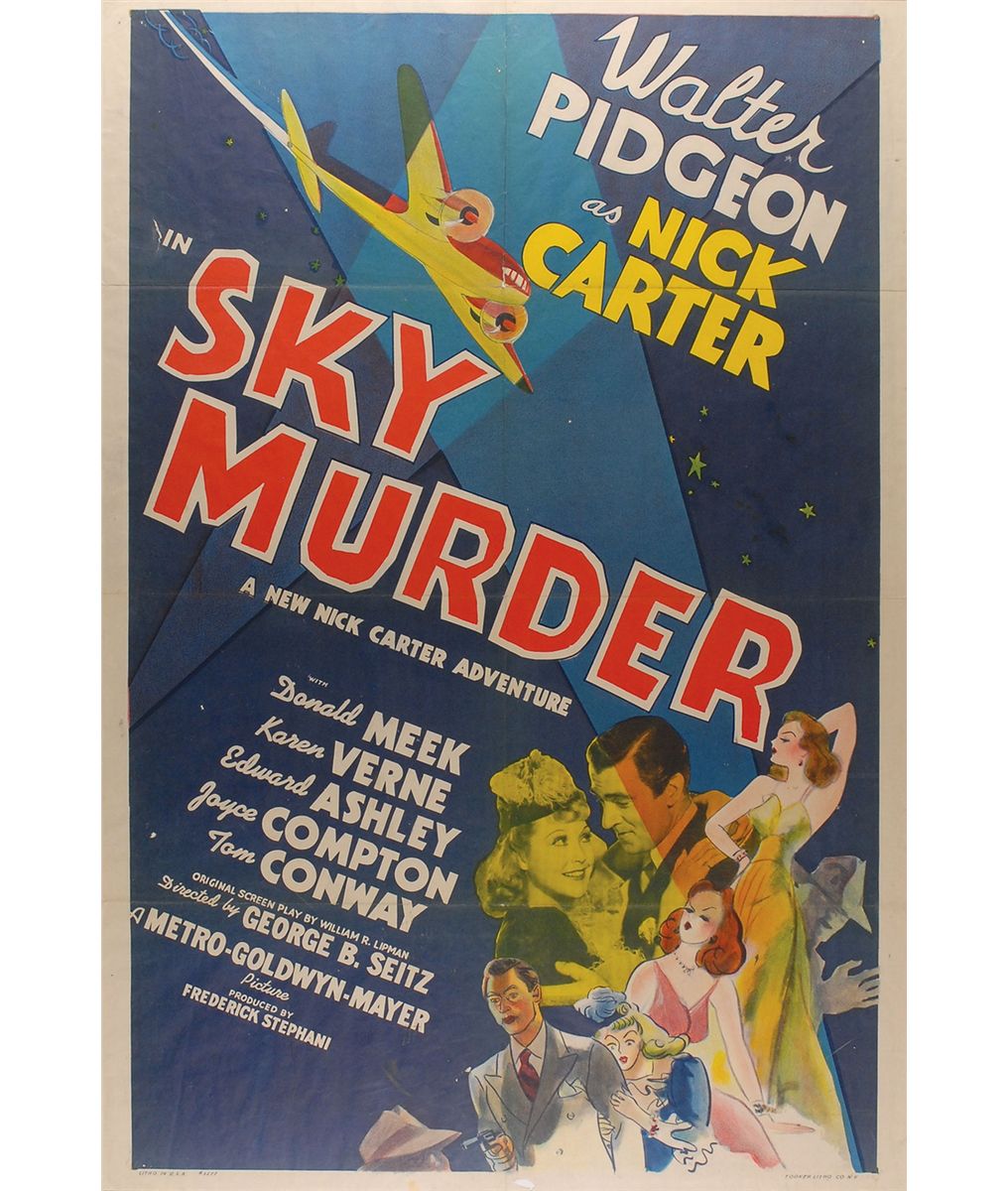 Original color 27 x 41 one-sheet movie poster for the 1940 film Sky Murder, starring Walter Pidgeon, Donald Meek, and Karen Verne. In very good condition, with a few small separations along intersecting storage folds, staple holes to corners, small area of paper loss along bottom border, and some scattered light soiling and staining.