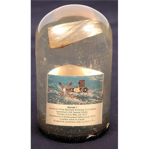 <Our item number 138344><B>Skylab 1, 1973, FLOWN Insulation.</B> (1.5x1") mounted in a clear lucite cylinder (4x2.5") with a descriptive brochure at the bottom. This piece of insulation was part of the debris that crashed back to earth in Kalfoolie, Australia in 1979. The cylinder is somewhat rubbed and in need of polishing, but this is an attractive piece of memorabilia that belongs in every collection. <BR>Estimated Value $150 - 250. <BR><BR>Our item number 138344<BR><IMAGES><P ALIGN="CENTER"><IMG SRC="http://www.goldbergcoins.net/liveauction/49jpegs/138344.jpg"> </P></IMAGES>