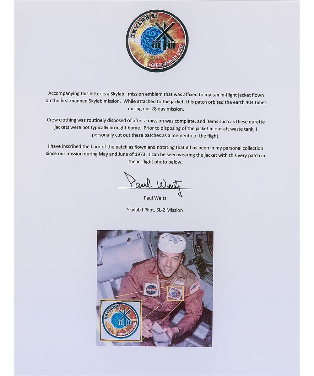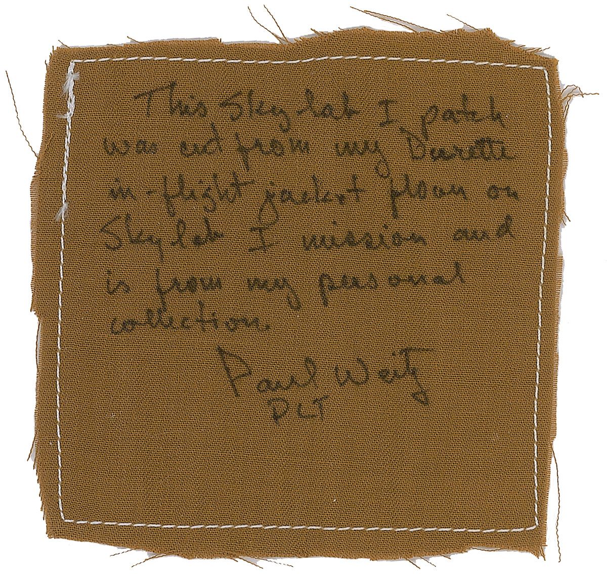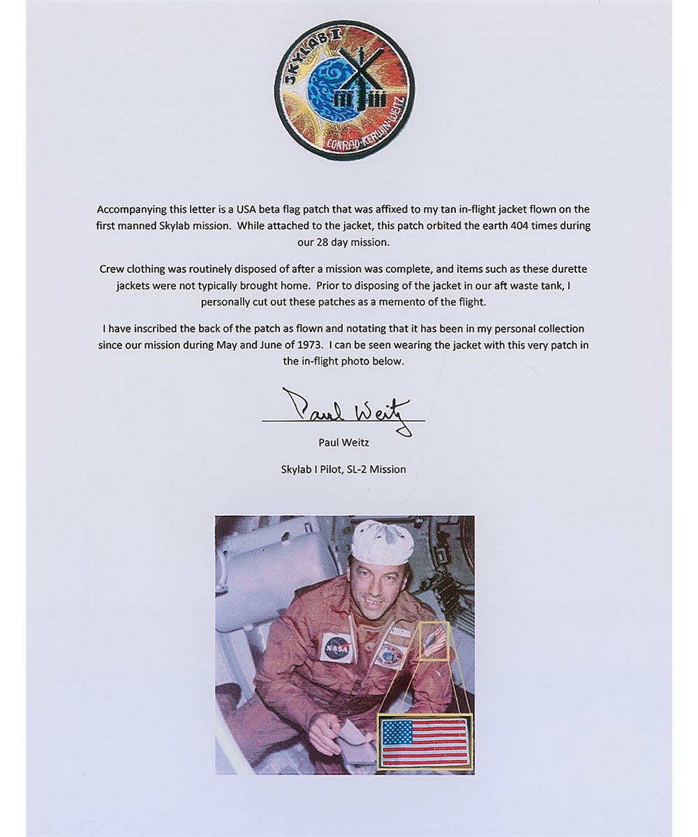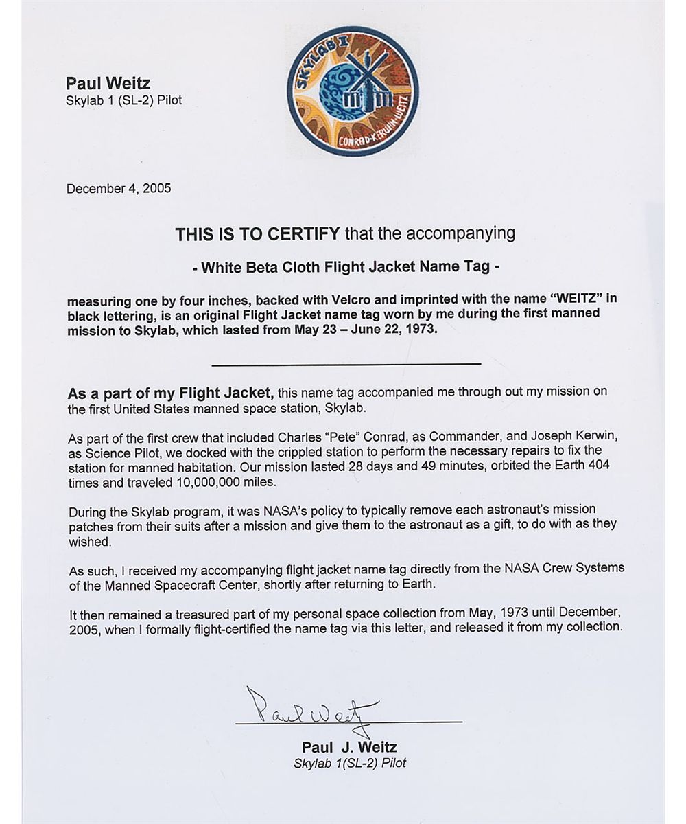 Three of Weitz’s flown patches and name tag from his in-flight jacket worn during his Skylab mission. First is a 3.75 x 3.75 mission patch, cut from the left breast of the jacket, signed on the reverse, “This Skylab I patch was cut from my Durette in-flight jacket flown on Skylab I mission and is from my personal collection. Paul Weitz, PLT.” Next is a 5 x 2.75 printed fabric American flag, cut from the left shoulder area, signed on the reverse, “This U. S. flag was cut from my Durette in-flight jacket flown on the Skylab I mission and is from my personal collection. Paul Weitz, PLT.” Also included is Weitz’s Beta cloth jacket name tag, 5.5 x 1, signed on the Velcro backing, “Flown SL-2, PW.” All three items are accompanied by individual certificates of authenticity from Weitz, two with photos of Weitz wearing the Durette in orbit, and also accompanied by a photo of Weitz holding the name tag. In fine condition. Weitz, and his patches, made 404 orbits of the Earth during their 28-day mission. The crew’s clothing was routinely disposed of after the completion of their mission, including their jackets, making these flown patches and name tag particularly uncommon.