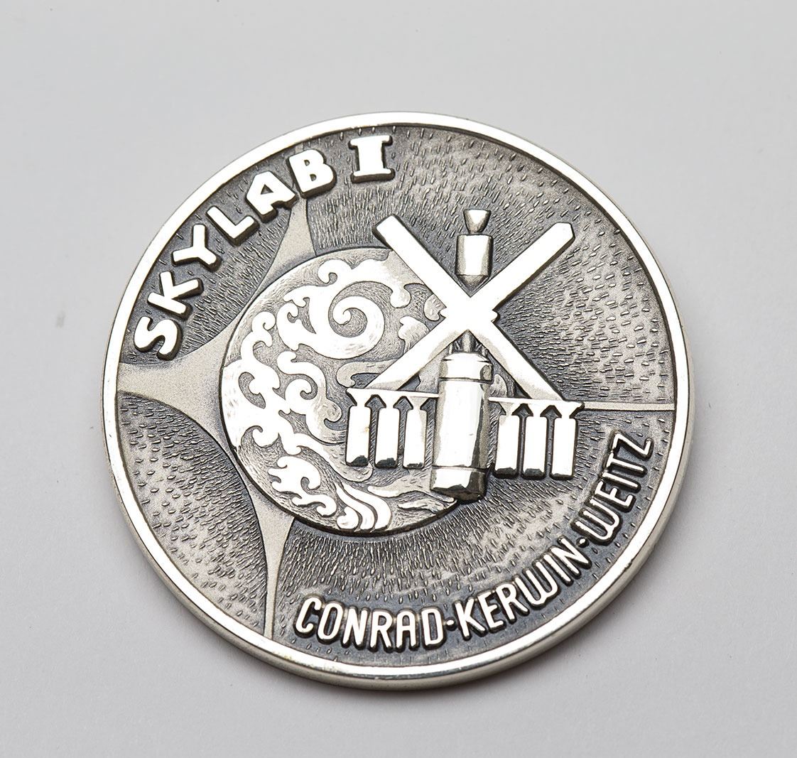 Unflown sterling silver Skylab 1 Robbins medal, possibly a prototype, approximately 1.25? in diameter, featuring a raised design of the mission insignia on the face. The reverse is engraved with the Skylab launch date of May 14, 1973, the crew launch date of May 25, 1973, and the crew return date of June 22, 1973. The medal lacks a serial number and is stamped with the Robbins hallmark on the edge. Condition is mint state. Accompanied by a small plastic box. From the collection of a former Robbins Company executive.