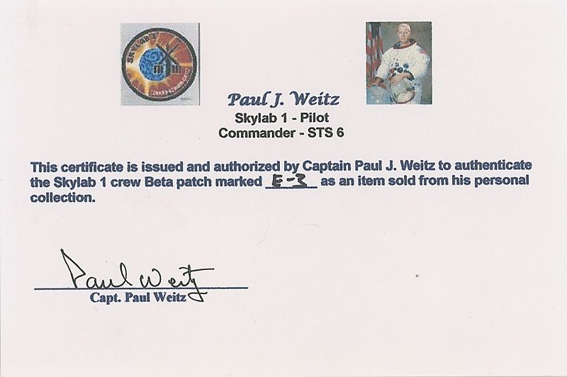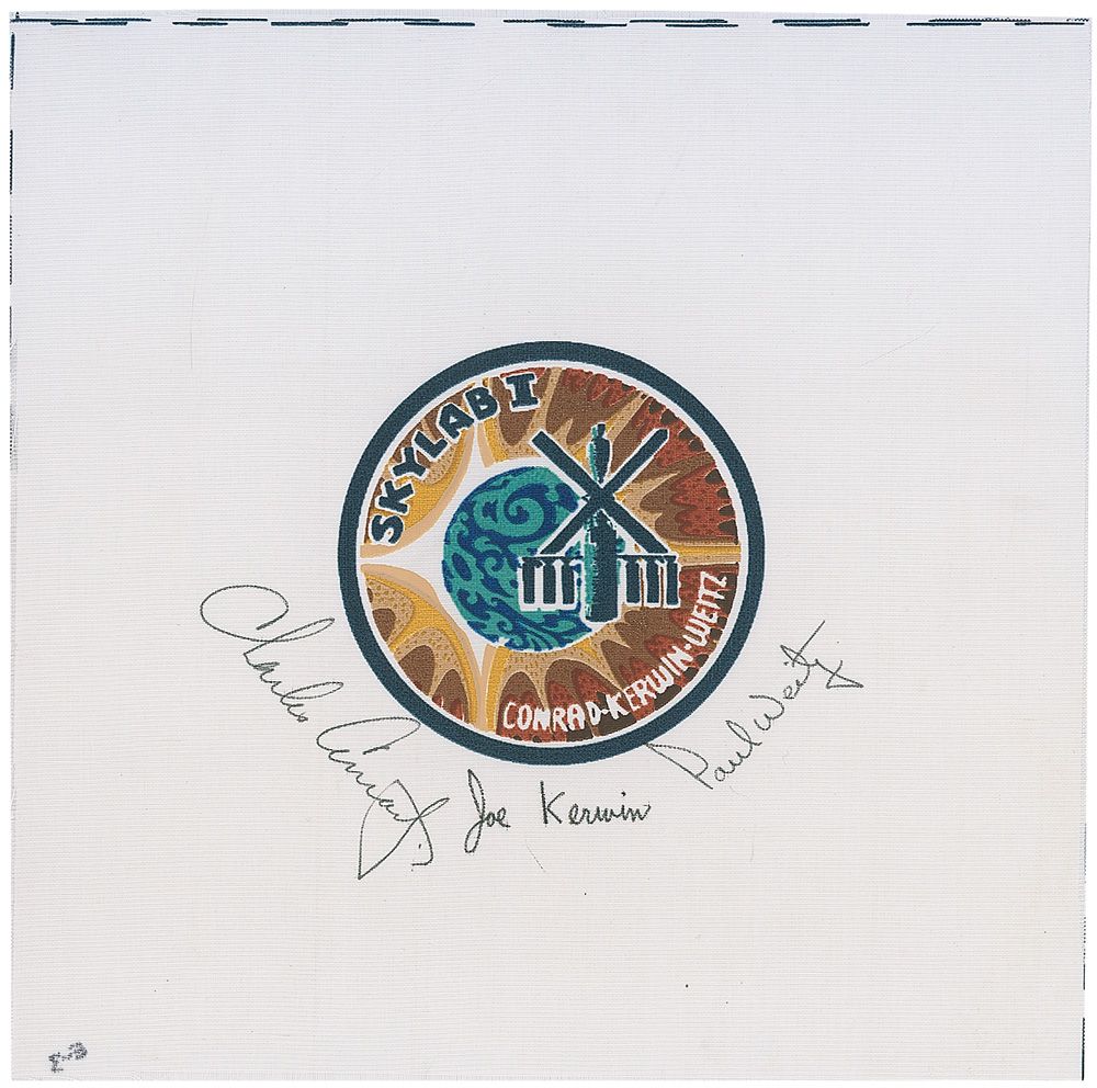 A 9 x 9 swatch of beta cloth bearing a printed 3.5-inch diameter Skylab I mission insignia, signed in black ink by Paul Weitz, Joe Kerwin, and Charles Conrad. In fine condition. Accompanied by a certificate of authenticity from Paul Weitz stating the cloth comes from his personal collection.