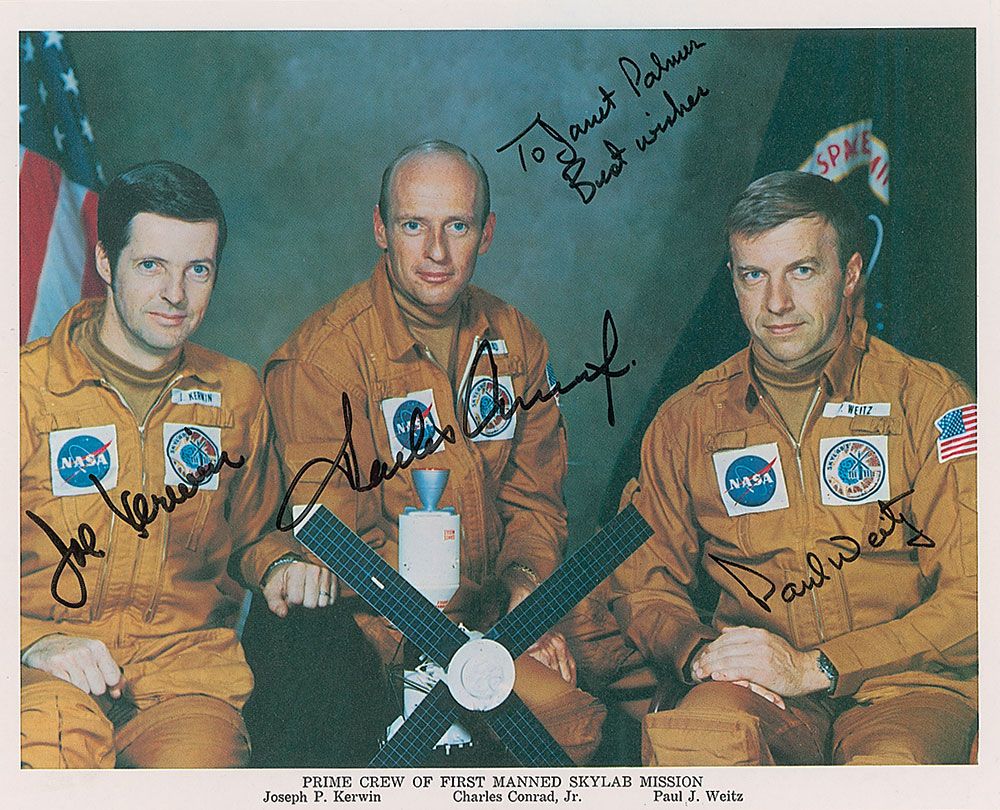 Color 10 x 8 NASA photo of Skylab’s first crew, signed in black felt tip by Joe Kerwin, Charles Conrad, and Paul Weitz, who also adds a brief inscription. In very fine condition. A surprisingly difficult-to-find photo.