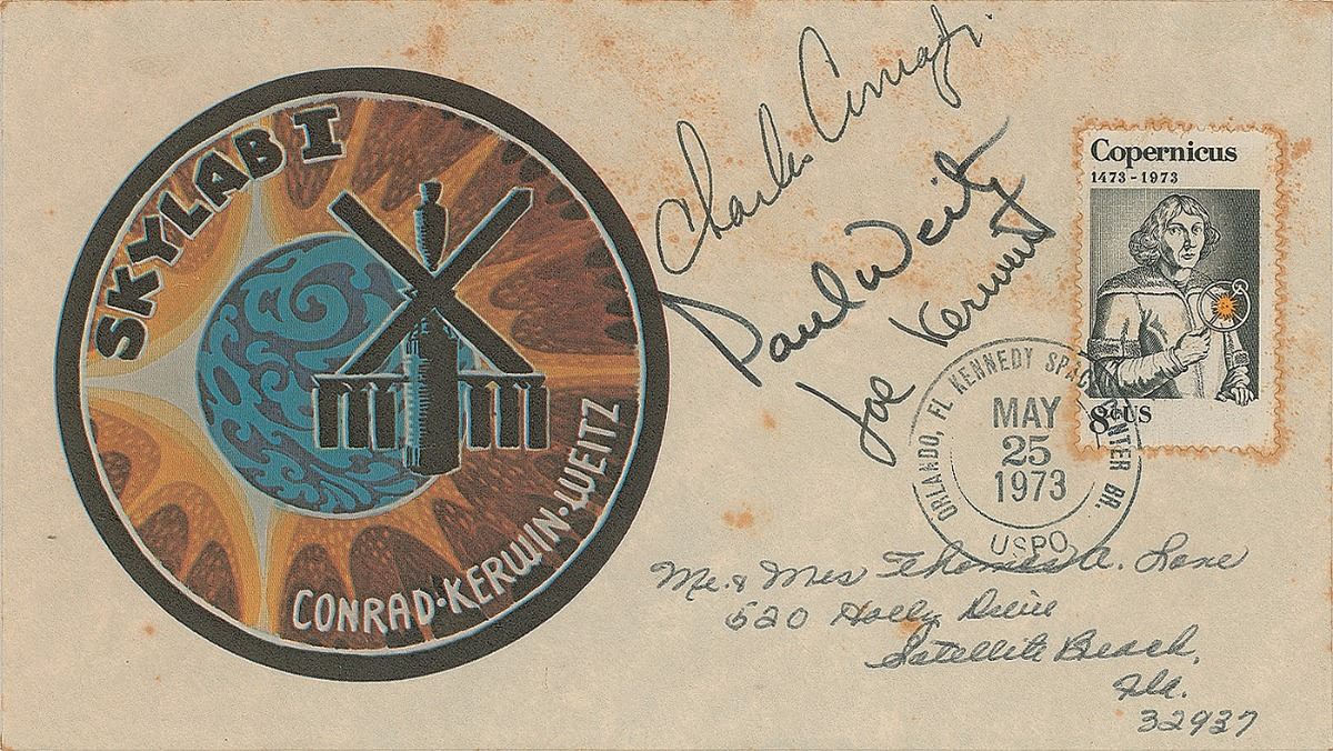 Commemorative launch day cover with a cachet honoring the Skylab 2 mission, signed in black ink and felt tip by Charles Conrad, Paul Weitz, and Joe Kerwin. In very good condition, with scattered staining.