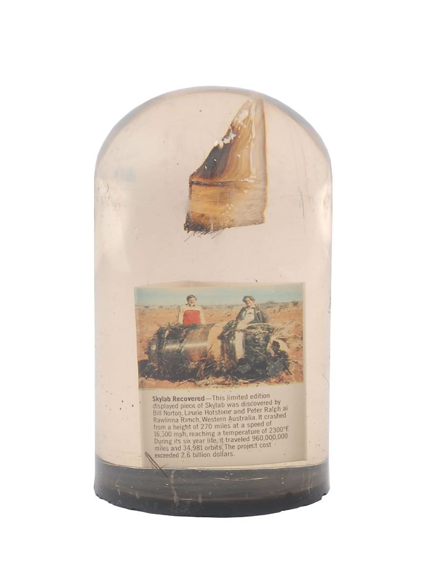 Flown fragment of a Skylab oxygen supply tank recovered by three people in Western Australia, presented in a 4.25? tall acrylic display above a small copy of a photo of the recovered tank, information on Skylab, and a 1979 letter from the leader of the NASA Skylab Team, sending thanks for assistance in the recovery. Light uniform toning and a few chips and scuffs to acrylic, otherwise fine condition.