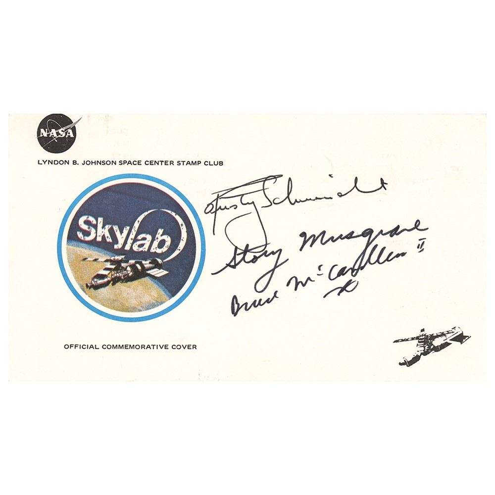 Commemorative cover issued by the Lyndon B. Johnson Space Center Stamp Club, featuring a color cachet honoring the Skylab program, signed in black felt tip by the backup crew of the first manned Skylab mission: Rusty Schweickart, Story Musgrave, and Bruce McCandless. In fine condition. Accompanied by a full letter of authenticity from Zarelli Space Authentication.