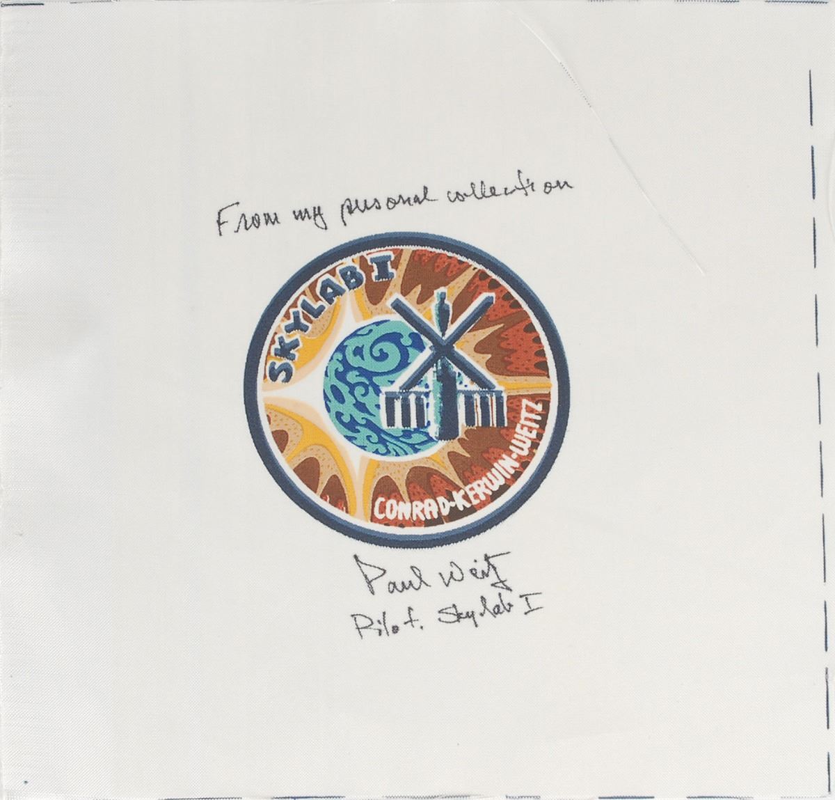 Two Beta cloth swatches, 8 x 8 and 9 x 9, both bearing a 3.5? diameter Skylab I (SL–2) mission insignia in the center, and signed in black felt tip, “From my personal collection, Paul Weitz, Pilot Skylab I,” with one patch double-matted and framed. In overall fine condition. Originating from the Astronaut Scholarship Foundation, a portion of the proceeds for the sale of this item will be donated to the ASF.
