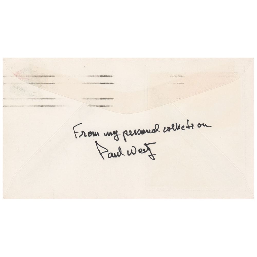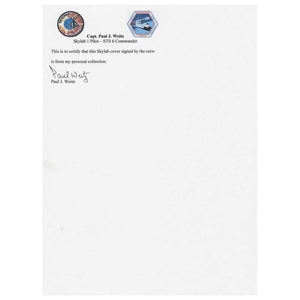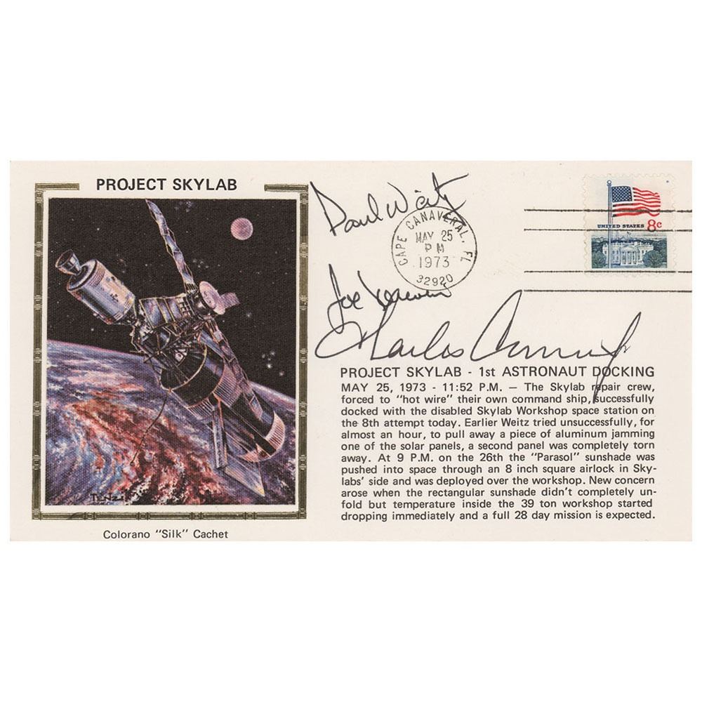 Paul Weitz’s Project Skylab commemorative cover with a ‘Colorano’ silk color cachet honoring the mission, postmarked on the Skylab 2 launch date of May 25, 1973, signed on the front in black ink by Charles Conrad, Joe Kerwin, and Paul Weitz, with the latter also signing the reverse and stating that the cover is “From my personal collection.†Includes a signed letter of provenance from Weitz. In fine condition.