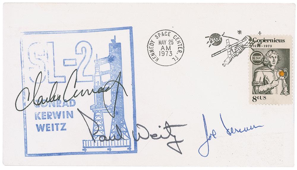 Commemorative cover with a cachet honoring the Skylab 2 crew, signed in felt tip and ink by crew members Charles Conrad, Joe Kerwin, and Paul Weitz. In fine condition.