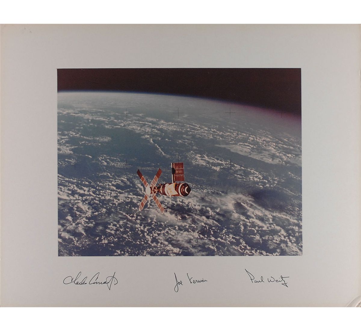 Color 13.5 x 10.5 photo of Skylab in orbit, affixed to its original 20 x 16 mount, signed on the mount in black ink by crew members Charles Conrad, Joe Kerwin, and Paul Weitz. In fine condition, with some dings to lower right corner of mount.