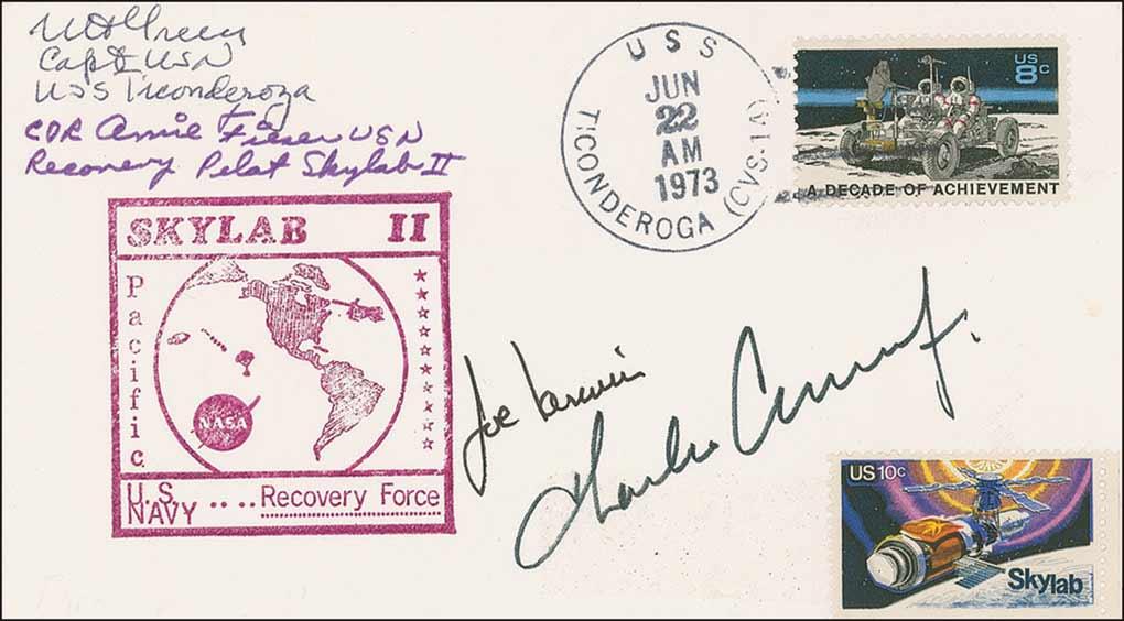 Skylab II prime recovery ship postal cover with a cachet honoring the naval recovery force of Skylab II, signed on the front in black felt tip by Joe Kerwin and Charles Conrad, as well as two members of the recovery force. In very fine condition.