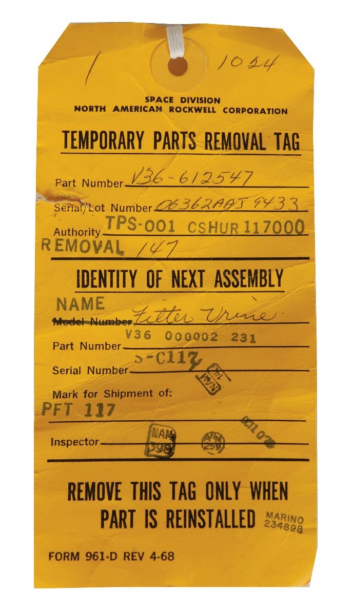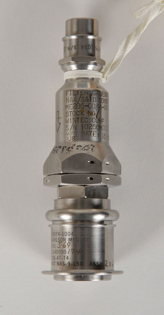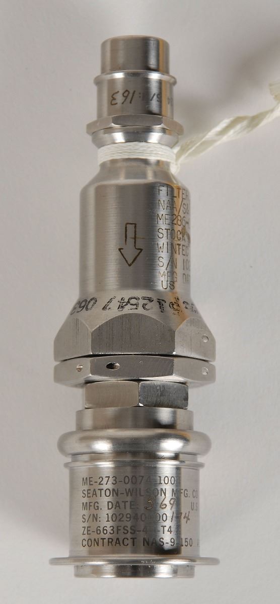 Spacecraft urine filter flown on the Apollo CSM-117 for the Skylab 3 mission, measuring approximately 4.25? long and 1.25? in diameter, engraved with parts numbers, “ME-273-0074-1004, Seaton-Wilson Mfg. Co., Mfg. Date: 5-69 U.S., S/N: 102940000174, ZE-663FSS-4T-T4, Contract NAS-9-150 Assy. 2069.” A temporary parts removal tag from North American Rockwell is attached. In fine condition.
