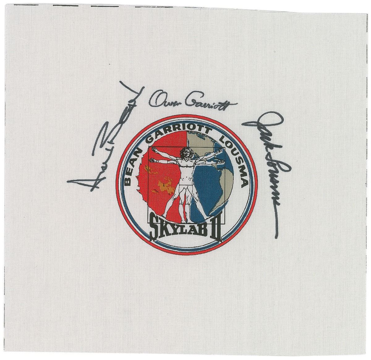 A 9 x 8.75 swatch of Beta cloth bearing a 3.5? diameter Skylab II (SL–3) mission insignia in the center, signed around the emblem in black felt tip by Alan Bean, Owen Garriott, and Jack Lousma. In fine condition.
