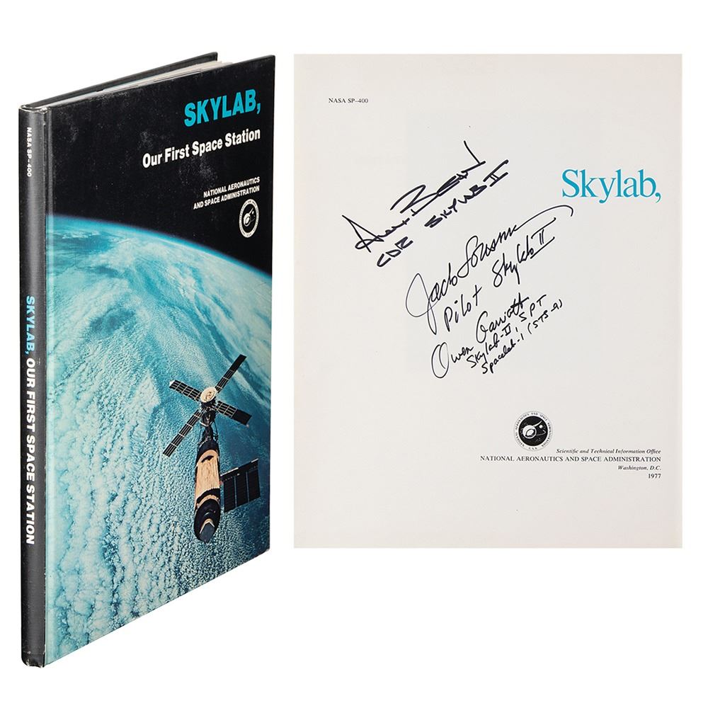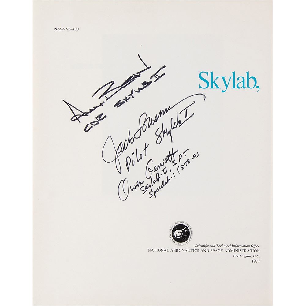 Signed book: Skylab, Our First Space Station. Washington, DC: NASA: Science and Technical Information Office, 1977. Hardcover, 9.5 x 11.75, 164 pages. Signed on the left-side title page in black felt tip by the Skylab 3 crew: "Alan Bean, CDR Skylab II," "Jack Lousma, Pilot Skylab II," and "Owen Garriott, Skylab-II, SPT, Spacelab-1 (STS-9)." In fine condition.