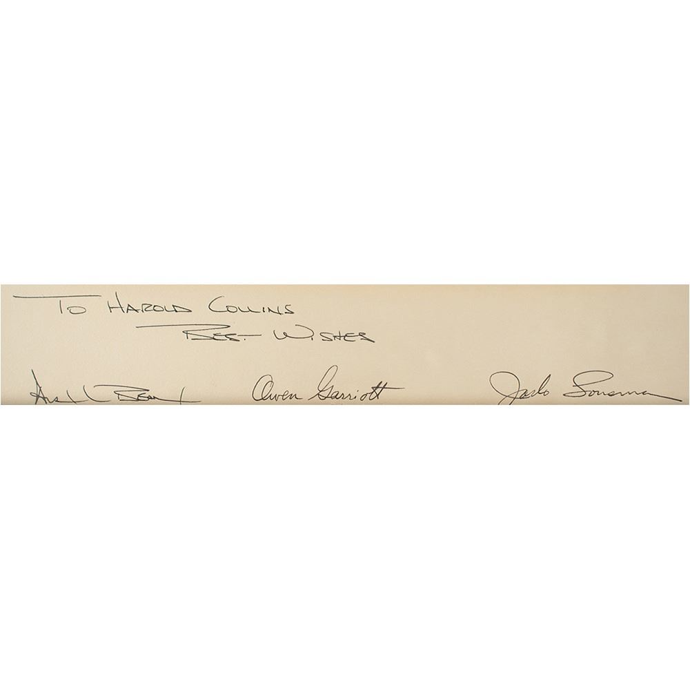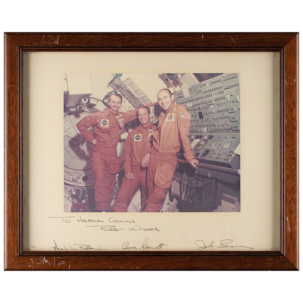 Official color glossy 9.5 x 7.5 NASA photo of the crew of Skylab 3 posing together in their beige space suits, signed and inscribed on the original mount in black ink, "To Harold Collins, Best wishes, Alan L. Bean,†“Owen Garriott,†and “Jack Lousma.†Framed to an overall size of 16 x 13. In fine condition, with tack holes to the corners.