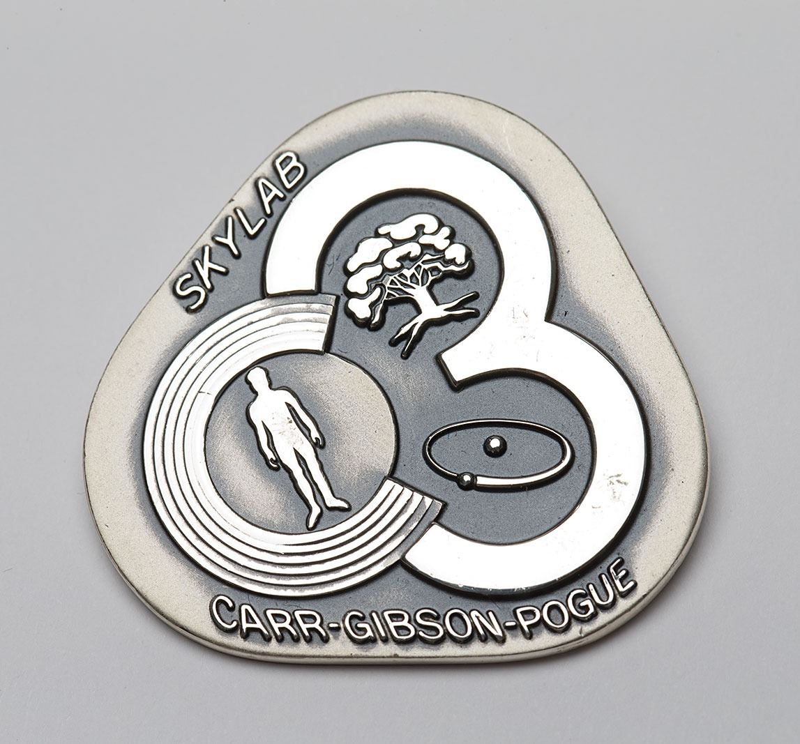 Unflown sterling silver Skylab 3 Robbins medal, possibly a prototype, approximately 1.25? in diameter, featuring a raised design of the mission insignia on the face. The reverse is engraved with the missions launch and return dates, "Nov. 16, 1973 to Feb. 8, 1974," and stamped with the Robbins hallmark. The medal lacks a serial number. Condition is mint state. Accompanied by a small plastic box. From the collection of a former Robbins Company executive.