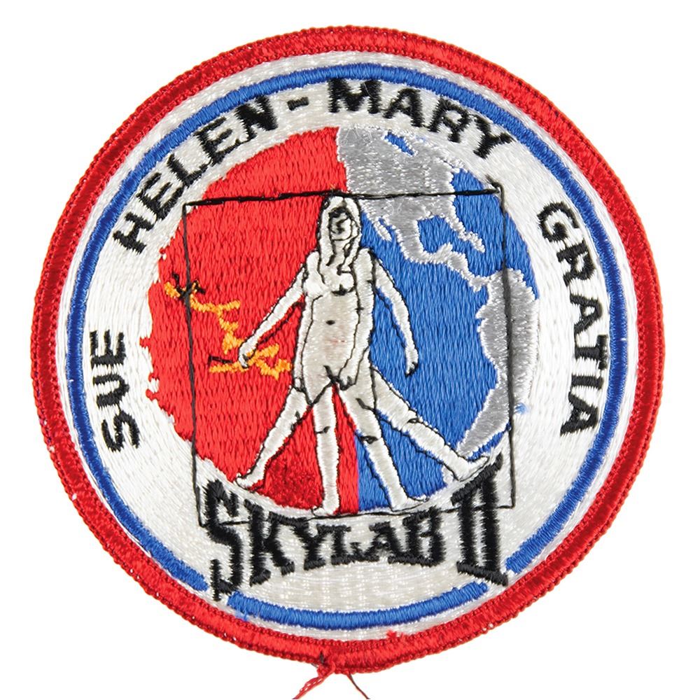 Rare original Skylab 3 (SLM-2) wives patch, 4Ë in diameter, fully embroidered with a merrowed edge and ‘tail.’ In fine condition. A limited distribution of 320 examples of this variant patch was made by Cape Kennedy Medals.