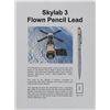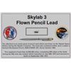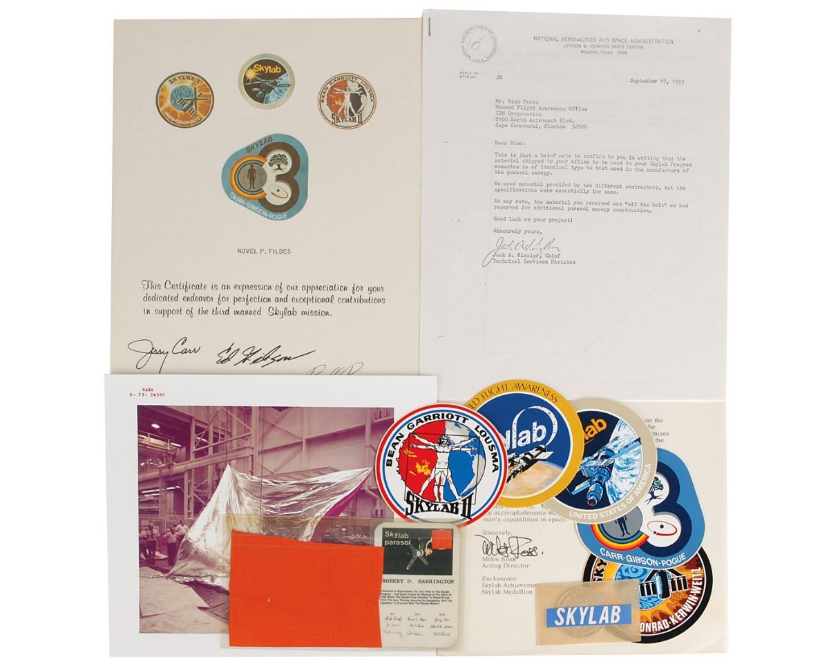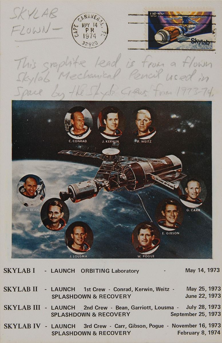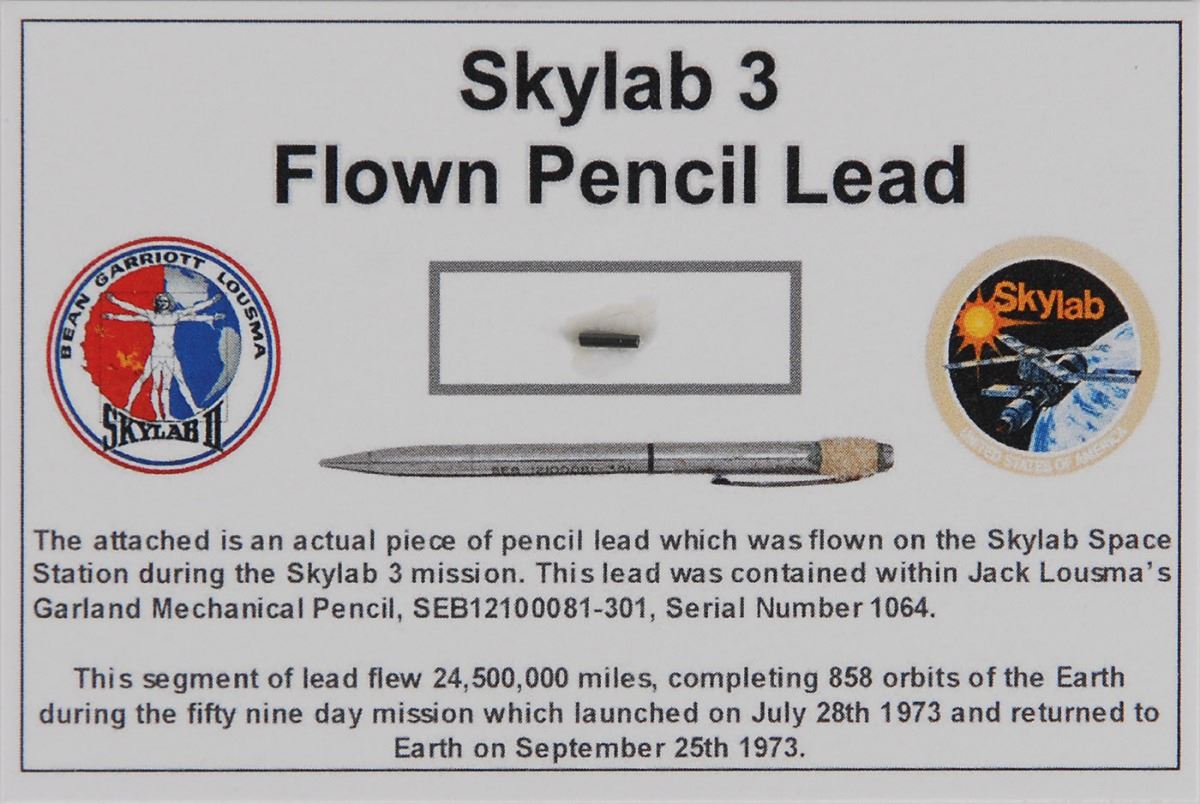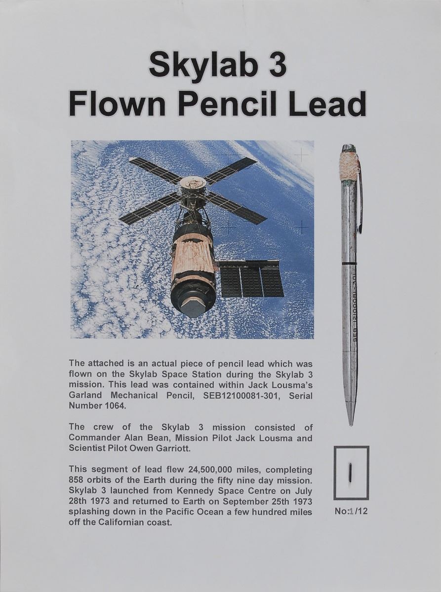 Three segments of graphite pencil lead flown on the Skylab 3 and 4 missions, each affixed to a presentation certificate. Also includes a section of Skylab parasol material, a commemorative medallion, five different decals, a red-numbered NASA photo, and certificate bearing pre-printed signatures of the SL-4 astronauts. In overall fine condition. From the collection of aerospace memorabilia specialist Ken Havekotte.