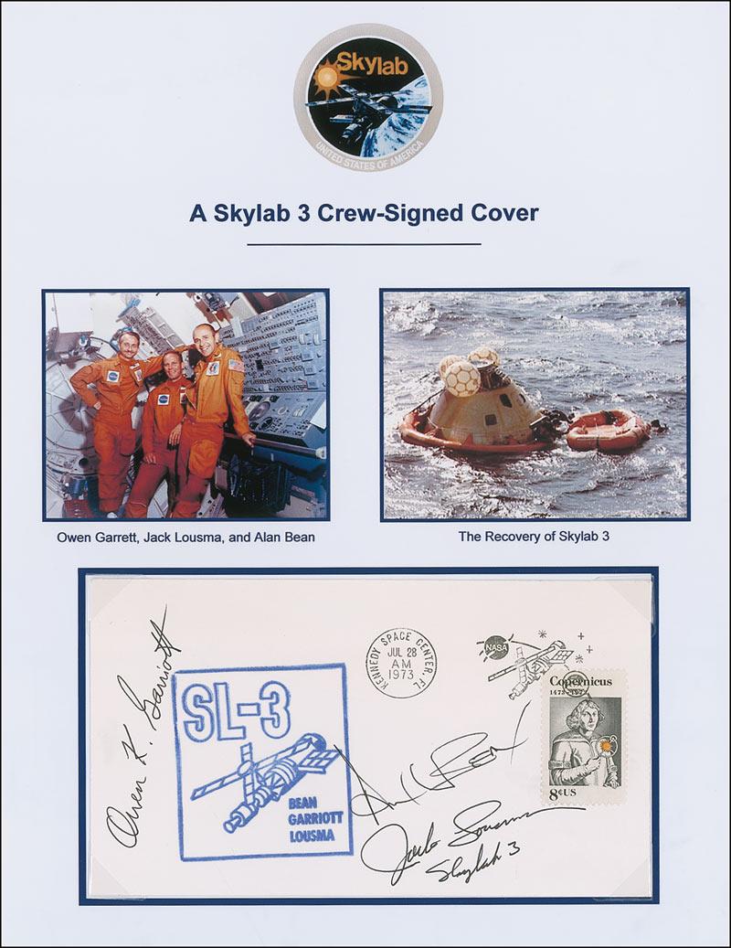 Skylab 3 prime recovery ship postal cover with a cachet honoring the Skylab 3 recovery, 6.5 x 3.5, signed in black felt tip by Owen Garriott, Jack Lousma (adding “Skylab 3”), and Alan Bean. Removably presented on a color 8.5 x 11 informational sheet. In fine condition, light block of toning over beginning of Garriott’s signature.