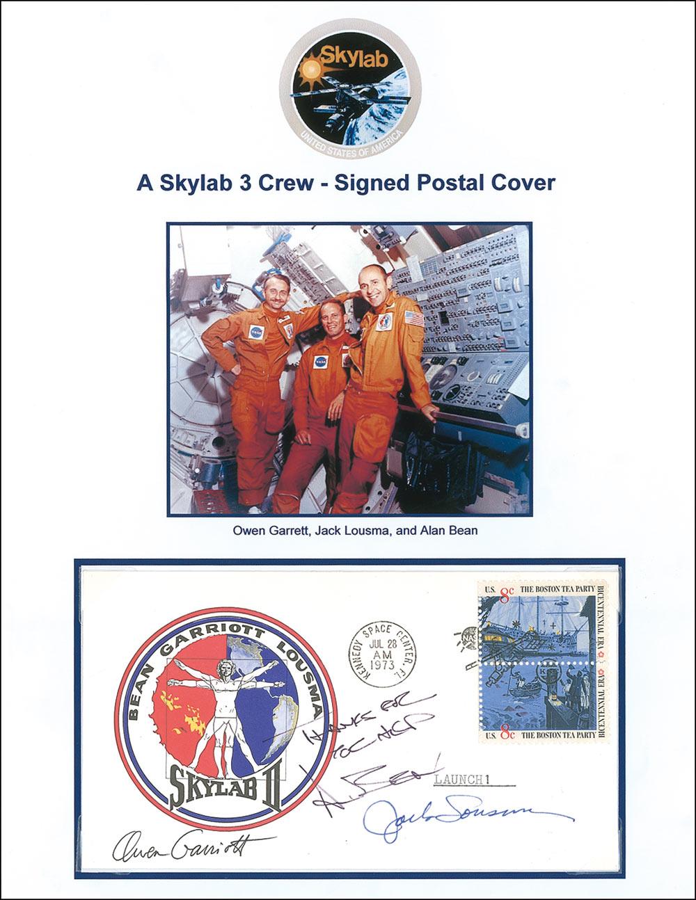 Skylab 3 Launch date postal cover with a cachet honoring the Skylab mission, signed in blue and black ink by Owen Garriott, Jack Lousma, and Alan Bean, adding “Thanks for your help.” Removably presented on a color 8.5 x 11 informational sheet. In very fine condition.