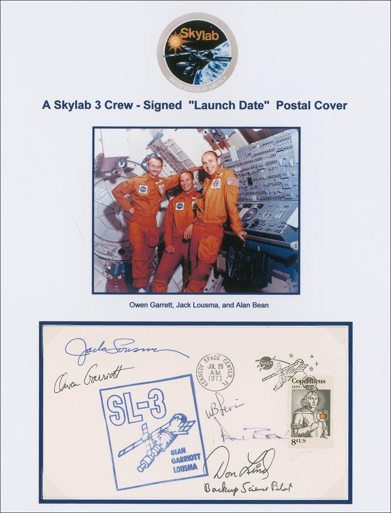 Skylab 3 launch date postal cover with a cachet honoring the Skylab mission, signed in blue and black ink by Owen Garriott, Jack Lousma, and Alan Bean. Also signed by two recovery personnel. Removably presented on a color 8.5 x 11 informational sheet. In fine condition.