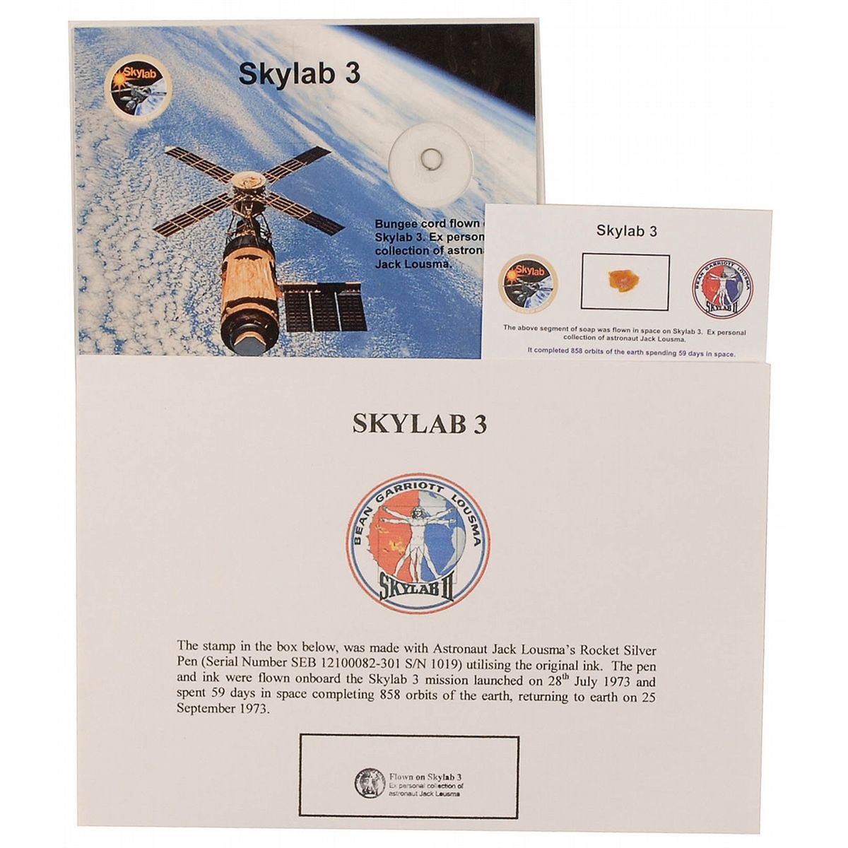 Three flown relics from Skylab III: a small circular piece of a bungee cord; a swatch of soap; and a stamp made from the ink of Jack Lousma’s pen which flew on Skylab III. All three relics are affixed to various sized informational cards and all originate from the personal collection of Jack Lousma. In fine condition.
