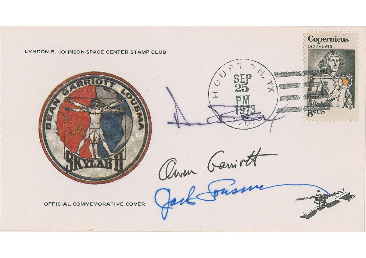 Commemorative cover with a cachet honoring Skylab II, signed in felt tip and ballpoint by Alan Bean, Owen Garriott, and Jack Lousma. In fine condition.