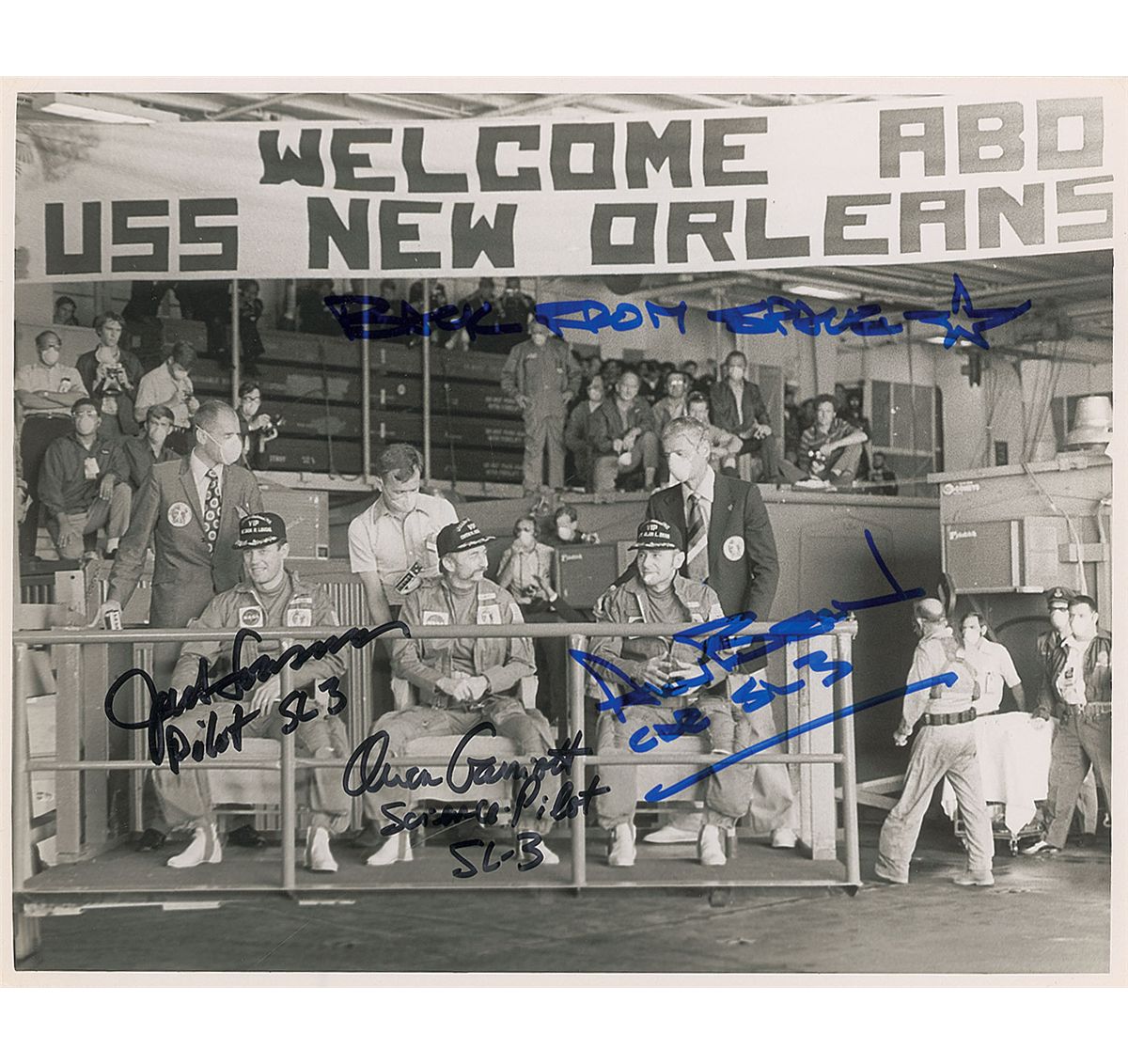 Official glossy 10 x 8 NASA photo of the reception for the Skylab 3 crew on board the USS New Orleans, signed in blue felt tip, “Back from space, Alan Bean, CDR SL3,” and in black felt tip, “Owen Garriott, Science pilot SL-3,” and “Jack Lousma, Pilot SL3.” In fine condition.