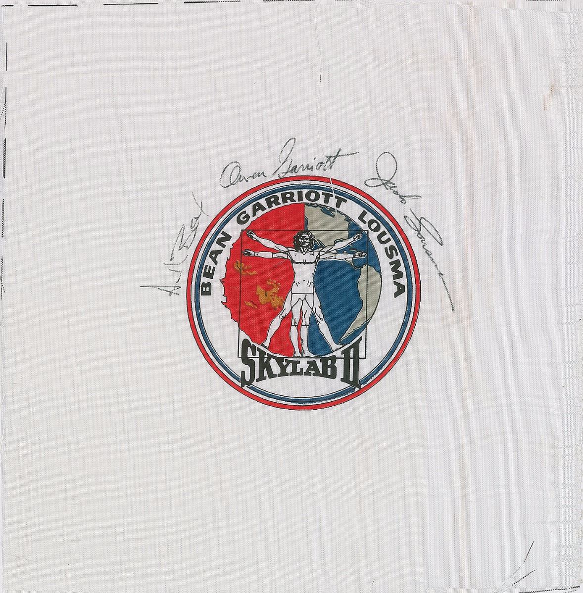A 9 x 9 swatch of Beta cloth bearing a 3.5? diameter Skylab II (SL–3) mission insignia in the center, signed around the emblem in black felt tip by Alan Bean, Owen Garriott, and Jack Lousma. In fine condition.