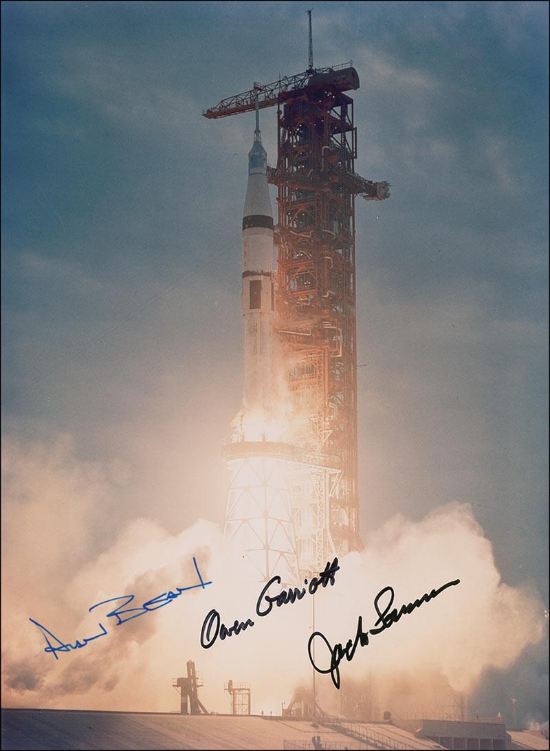 Color satin-finish 8 x 10 photo of the liftoff of the Skylab 3 crew, signed in black felt tip by Owen Garriott and Jack Lousma, and in blue felt tip by Alan Bean. In very fine condition.